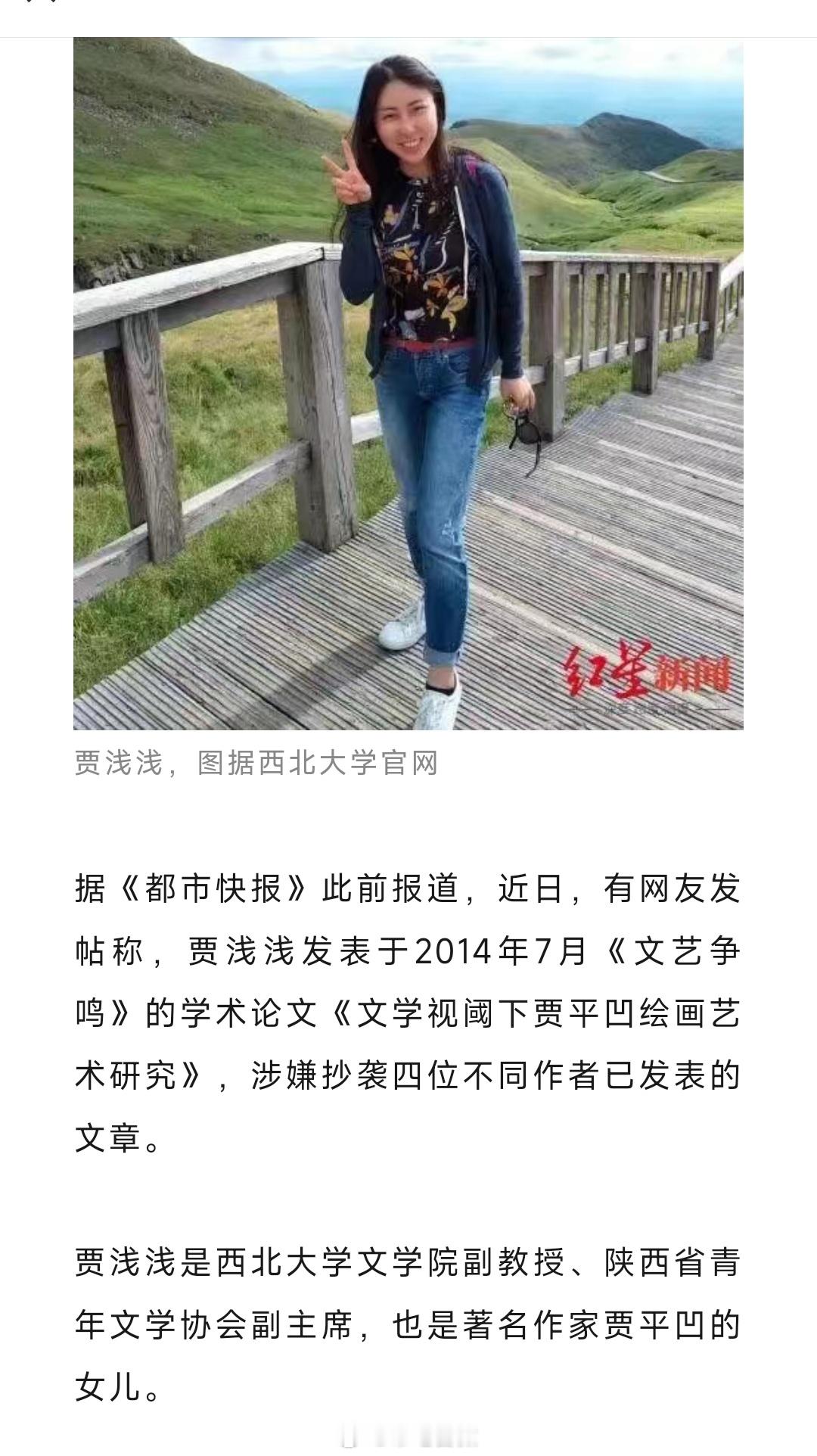 西北大学启动贾某某涉嫌论文抄袭调查。近日,有网友发帖称,贾浅浅发表于2014年7月《文艺争鸣》的学术论文《文学视阈下贾平凹绘画艺术研究》,涉嫌抄袭四位不同作者已发表的文章。