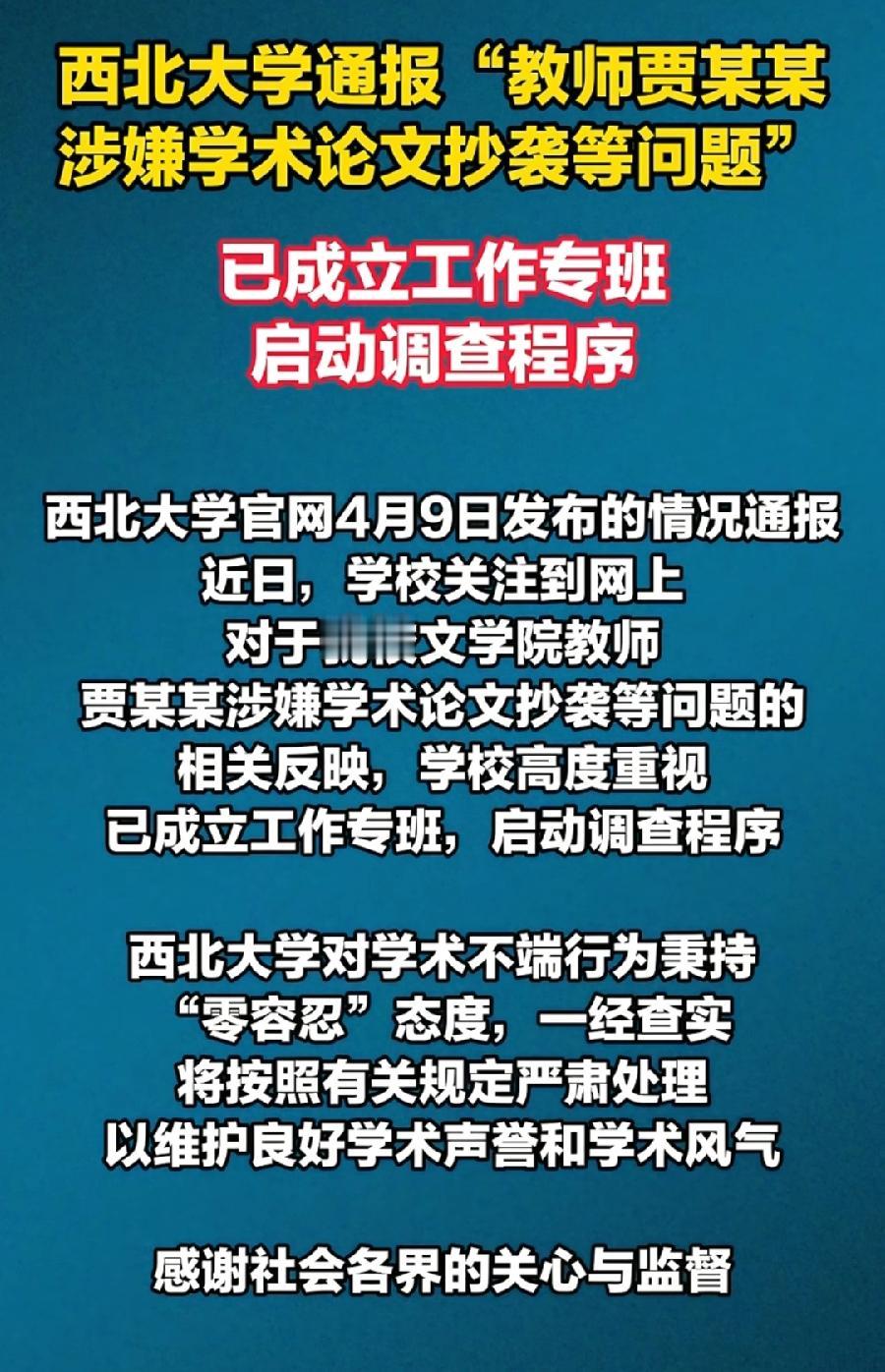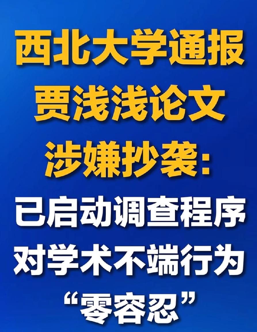 西北大学通报贾浅钱涉嫌论文抄袭。已成立专班,启动调查程序,学术不端零容忍!其实不用调查了,博主“抒情的森林”举报的证据,已经很详细清楚了,2篇论文抄袭4位学者,甚至还包括自己父亲贾平凹,评价别人书法的语录,直接拿来主义成自己的了!想起了周杰伦的那首歌,“以父之名”!之前屎尿体就被质疑吐槽至今,现在再起风波!贾浅浅麻烦不断!关注后续调查结果!