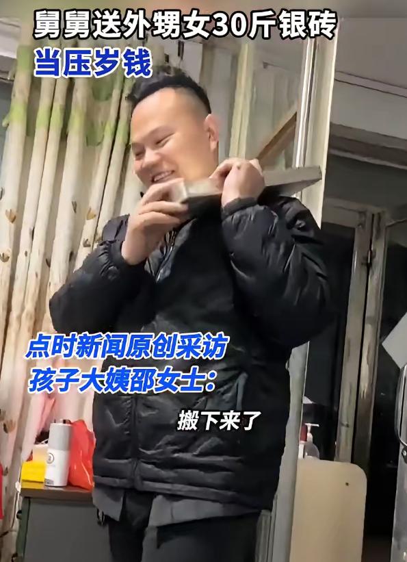 不过舅舅也没让外甥女空着手,没过多久,他又准备了一块小巧的银砖,只有几十克重,价值1000多块钱,上面还特意刻着“压岁钱”三个字,既精致又有纪念意义,孩子捧着小银砖,笑得特别开心。