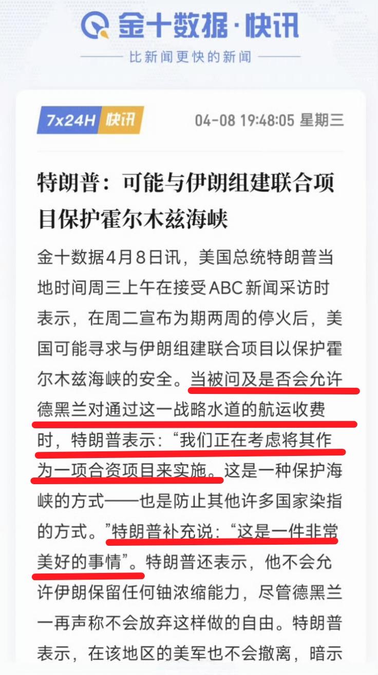 金毛“妙计安天下”[捂脸]--他说要和波斯合伙收霍尔木兹海峡过路费?!停火前一刻还喊着要抢霍尔木兹海峡的海峡收费权,刚一宣布停火他就直接改口要和波斯“合资经营”,一起在霍尔木兹海峡收油轮过路费,还说这是件“非常美好”的事。