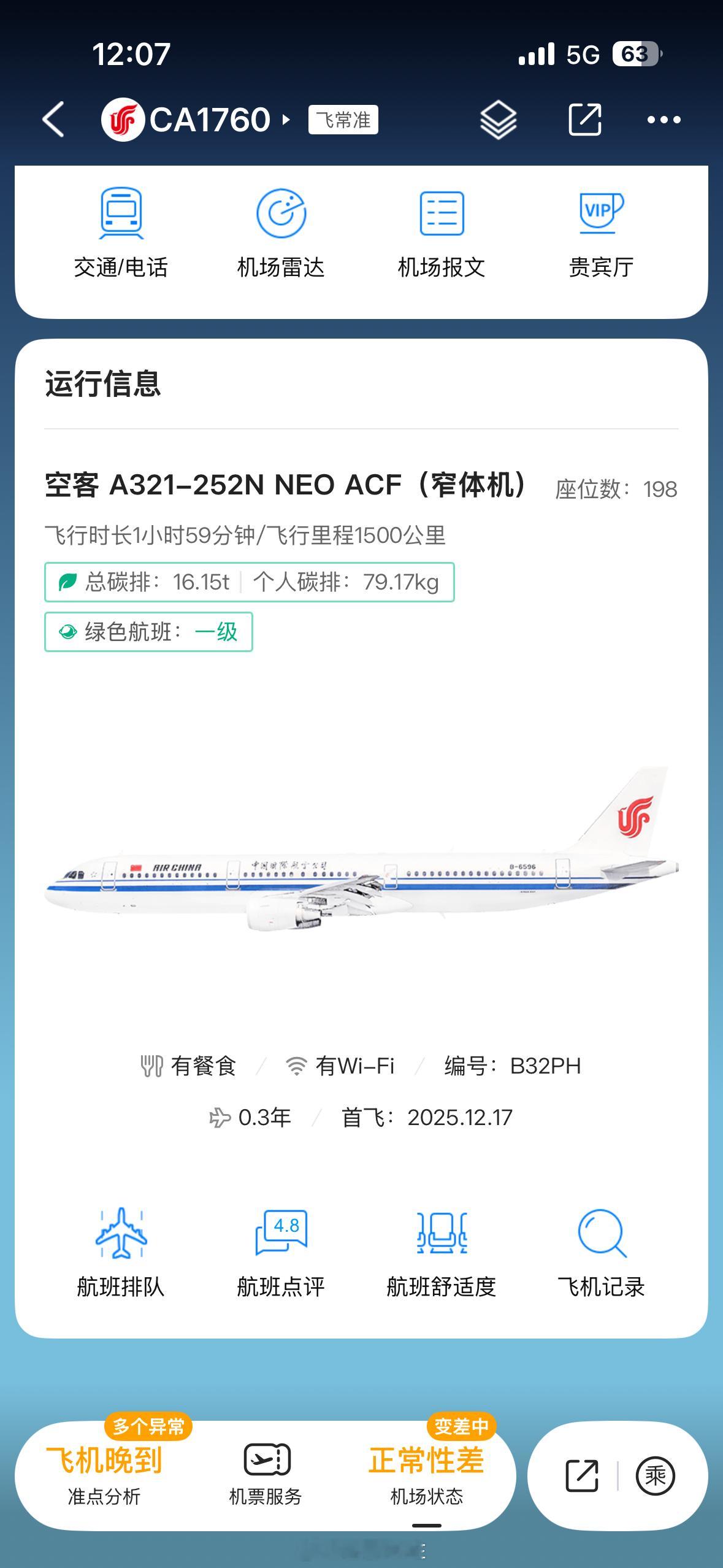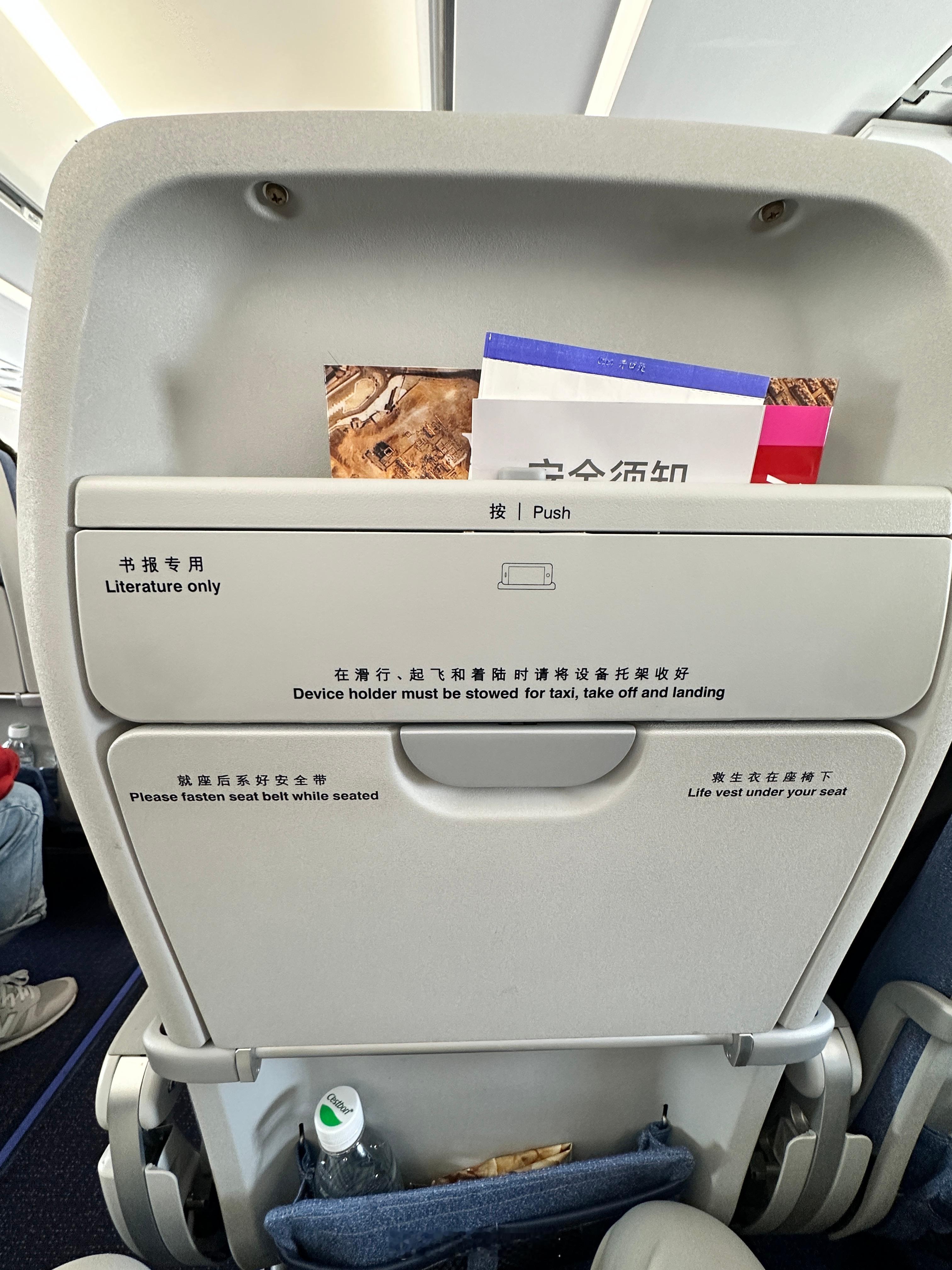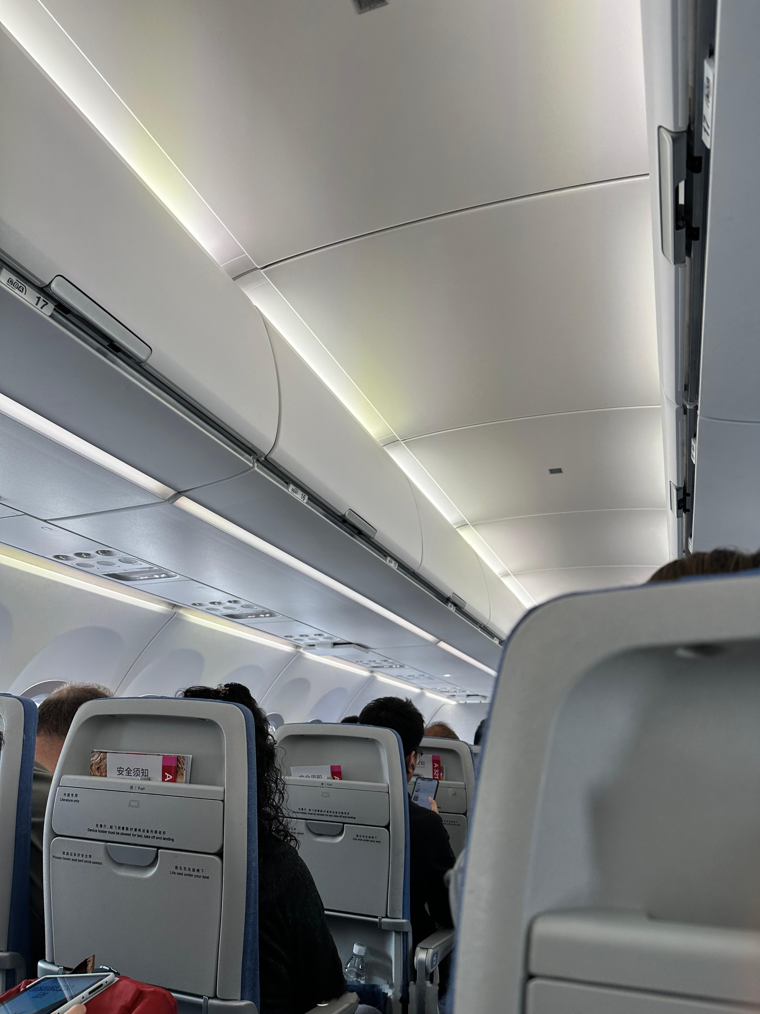 飞机 这是我乘坐过的最新的一架飞机了,一落座我就发现安全带特别新,又看了看别人的安全带固定卡,锃光瓦亮的,靠背袋有网兜,一定是新款设计。一查,果然,0.3年2025年12月17日首次飞行 重庆·重庆江北国际机场