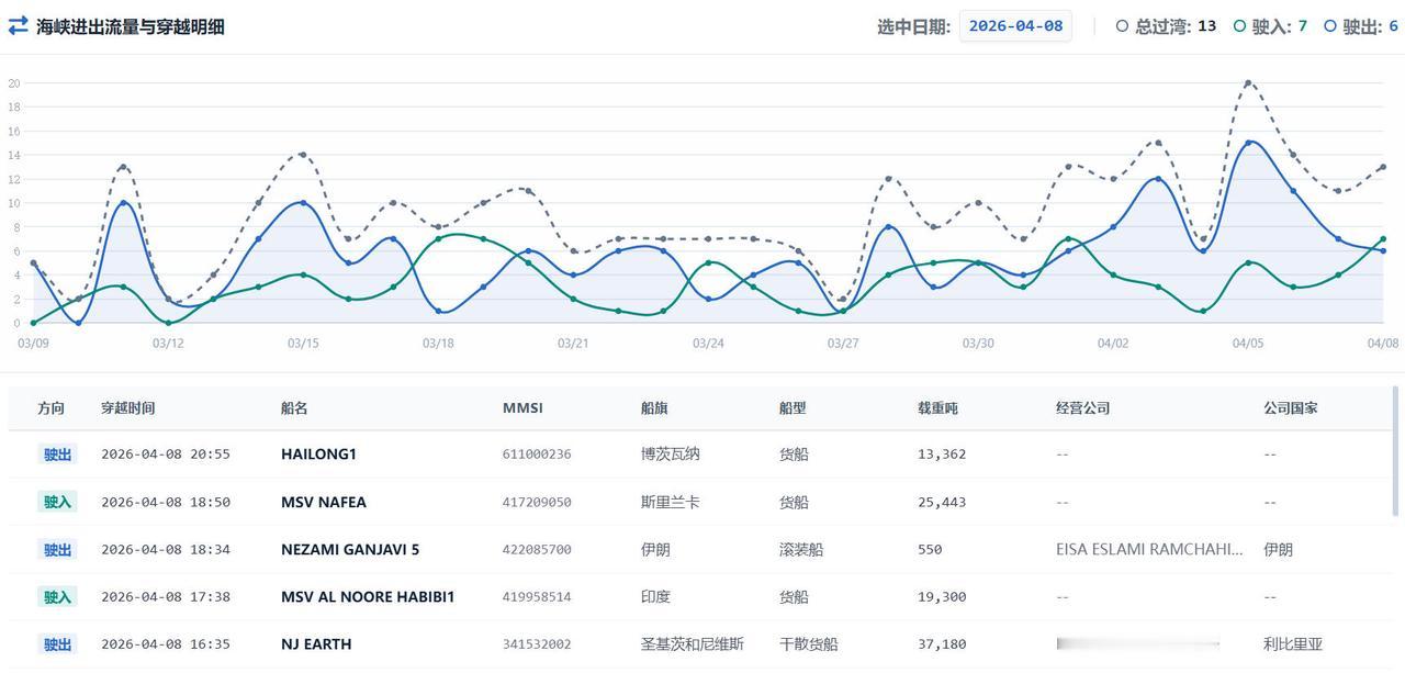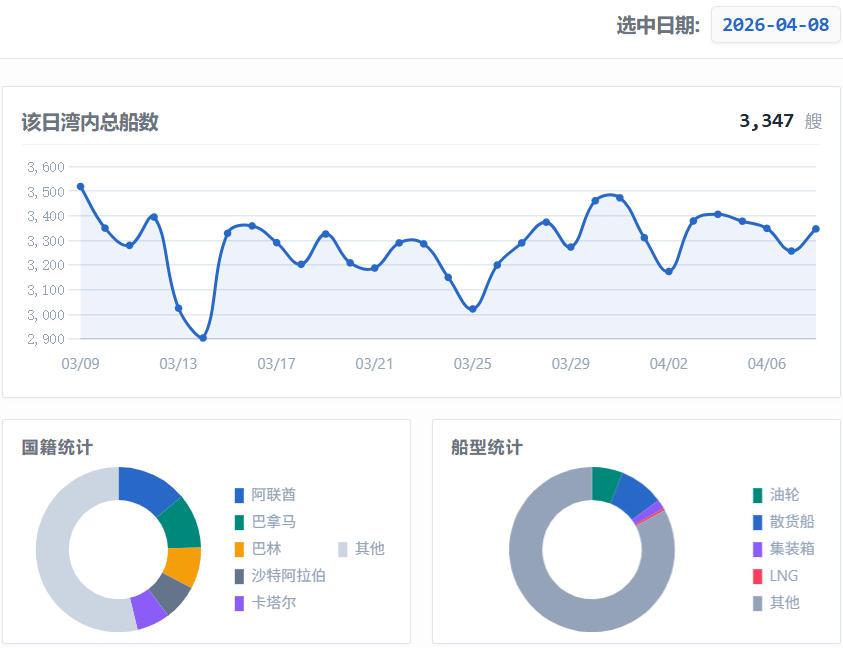从数据层面来看,霍尔木兹海峡的实际通航量远未恢复。昨日(2026年04月08日)仅有14艘船舶(7艘进港,7艘出港)穿越海峡,这一数字与和平时期日均135艘的水平相去甚远,也远低于此前报道的七天滚动平均值,有力驳斥了“海峡已开放”的说法。波斯湾在湾船舶总数在04月08日为3347艘,与前一日(3257艘)及近30日均值相比并无显著下降趋势,但新闻中提到的“逾800艘货轮被困波斯湾内”,特别是426艘原油及成品油轮,表明大量正规运力依然处于观望和滞留状态。然而,昨日穿越海峡的船舶明细中,一艘由中国公司运营的巴拿马籍化学品船“STARWAY”的出现,以及其他来自圣基茨和尼维斯、利比里亚等旗帜的散货船,暗示了在传统航运巨头谨慎观望的同时,“影子运力”或接受伊朗“新秩序”的运力正在活跃,并且可能享受“定向阻断”政策下的优先通行权。