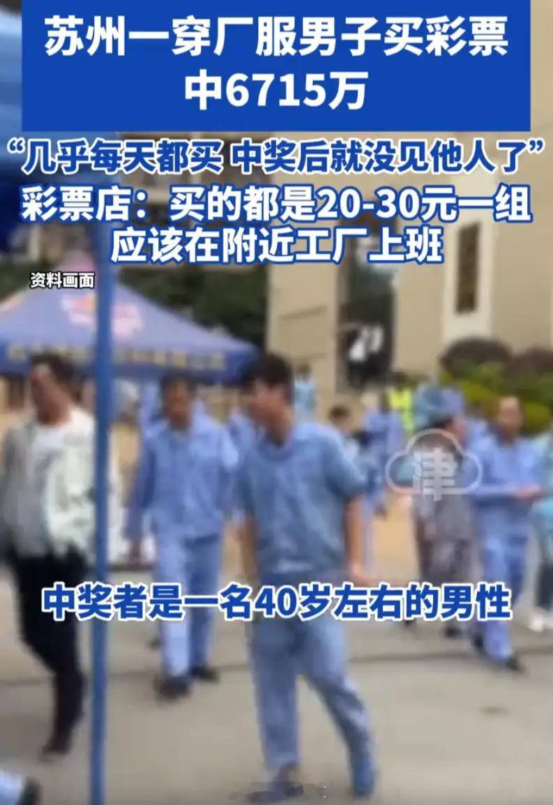 20元中6715万彩票店老板发声苏州穿厂服男子20元中6715万中奖者是一名穿厂服的中年男性,疑似附近工厂的普通工人。据彩票店老板描述,他过去两年几乎每日到店购彩,每次花费20-30元,坚持小额投注、守号购买,从不盲目追加投入。此次中奖的10倍倍投在其常规消费范围内,非临时冒险行为。税前奖金6715万元,税后约5372万元,中奖后未再现身彩票店,店主推测其正规划新生活。朋友们,今天你买彩票没?快来沾沾喜气!