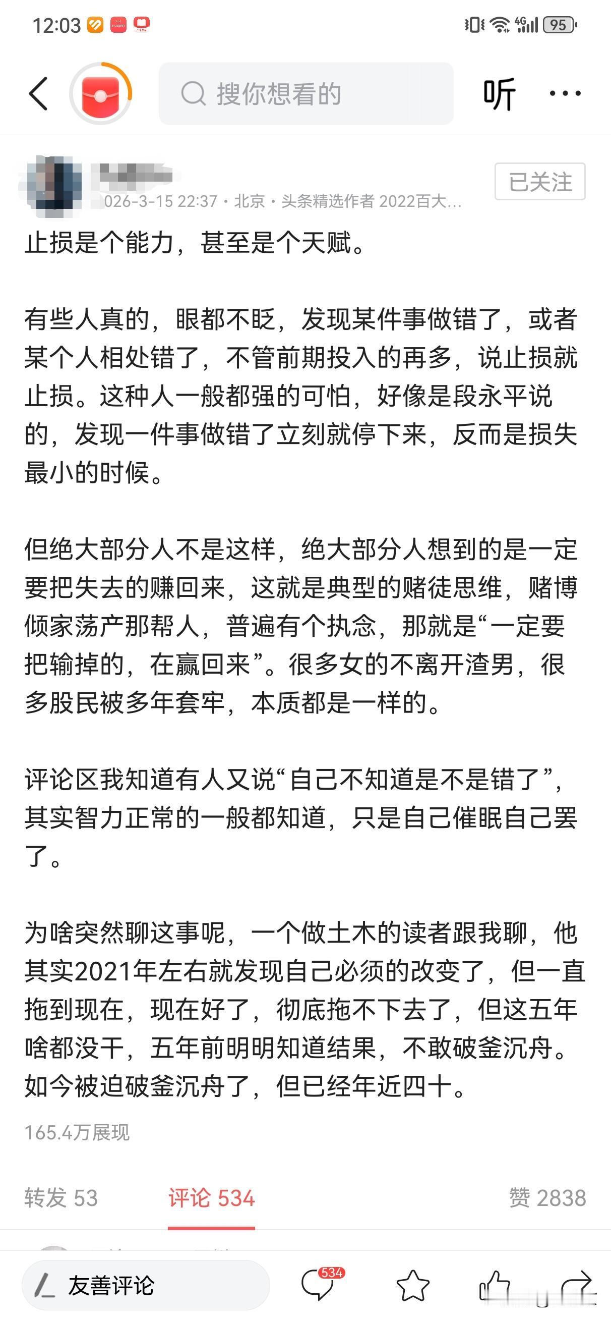 这就是爆款文的底层逻辑:不装、不端、不绕弯子,说普通人的事,戳普通人的痛,给普通人一点清醒。没有宏大叙事,没有专业术语,就像一个过来人跟你拉家常,却字字戳心,让你看完之后,忍不住转发、点赞,因为你想告诉自己,也告诉身边的人:别再硬扛了,该止损的时候,就果断一点。
