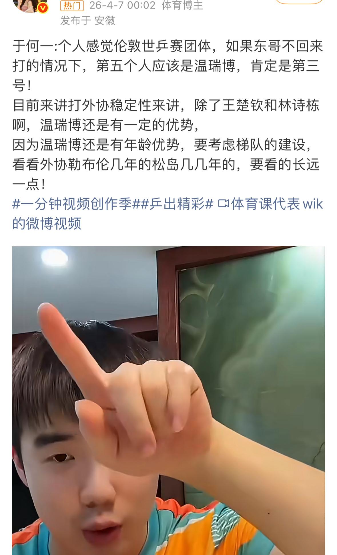 昨天,国乒公布的2026世乒赛大名单,男队五个名额中,梁靖崑压轴入选。此前,呼声非常高的国乒黑马小将温瑞博,最终没有出现在大名单内。