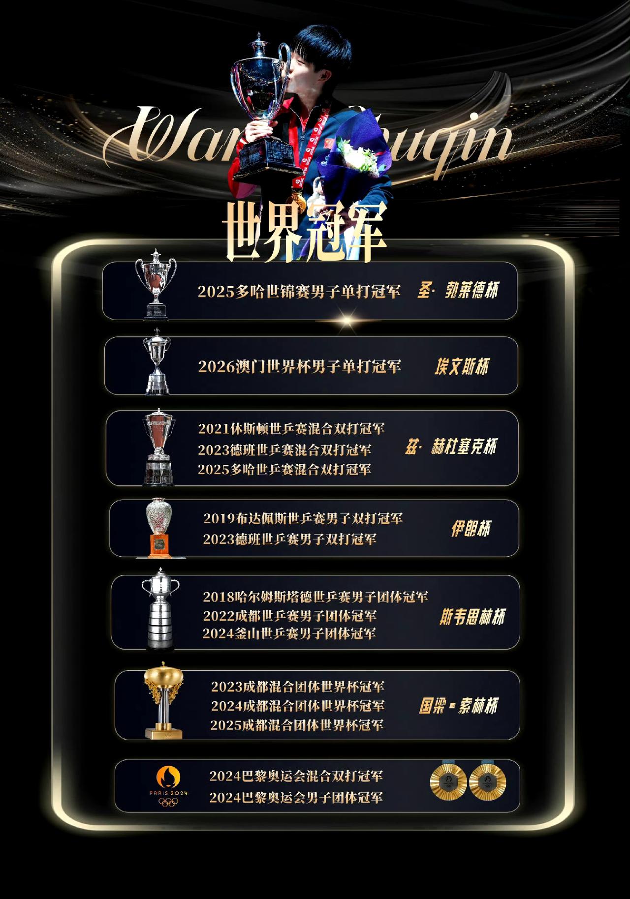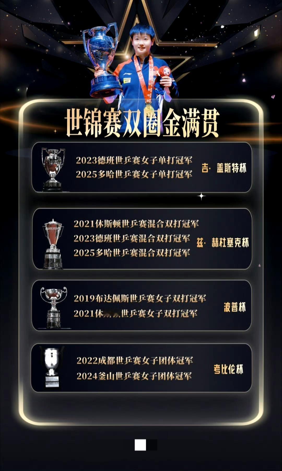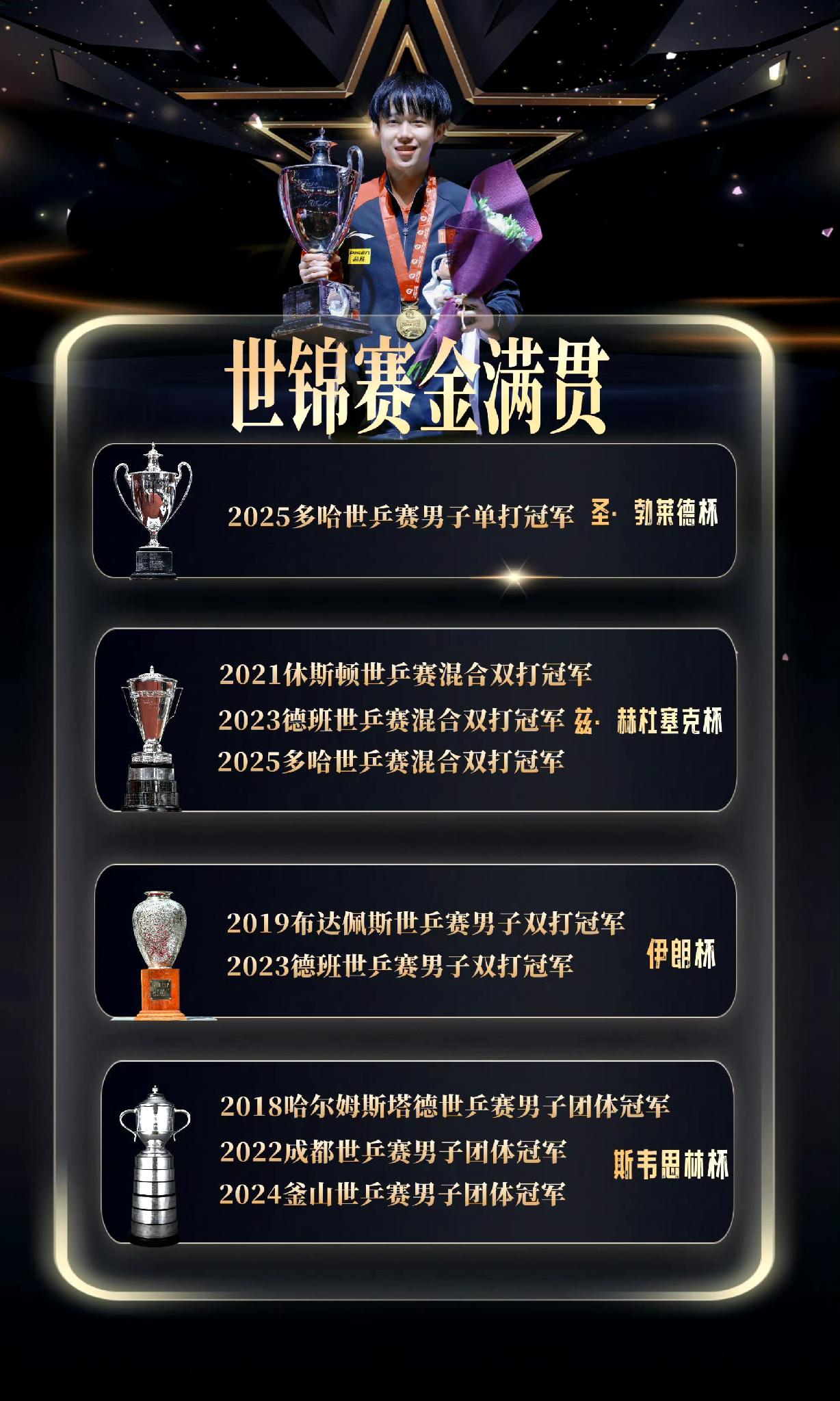 王楚钦解锁世锦赛金满贯,从圣·勃莱德杯到手,混双、男双、团体冠军拿到手软,更拿下澳门世界杯男单冠军,奥运金牌加身,成为乒坛史上又一位全满贯得主;孙颖莎更是达成世锦赛双圈金满贯,吉·盖斯特杯两度加冕,混双三连冠、女双、团体冠军悉数收入囊中,世界杯三连冠、奥运双金傍身,统治力拉满。