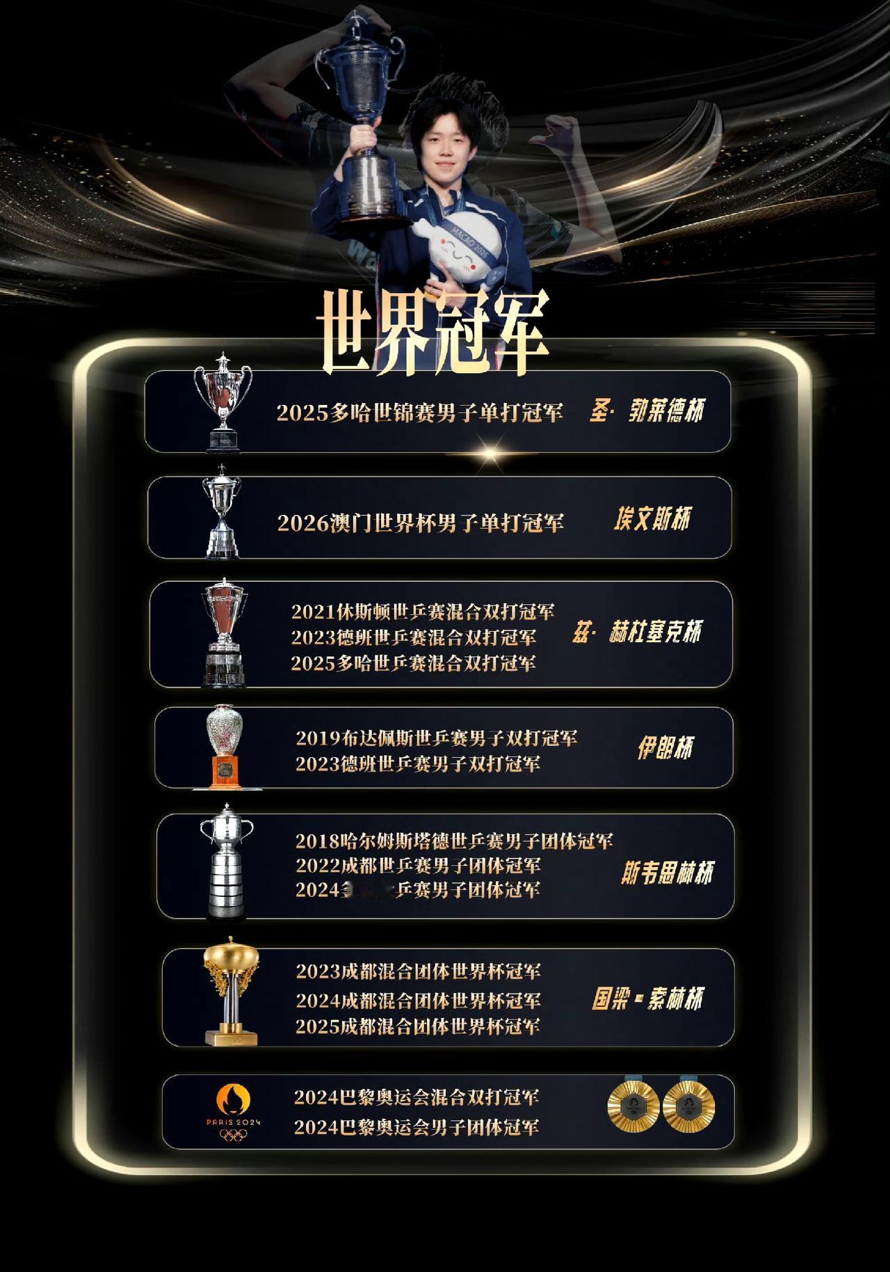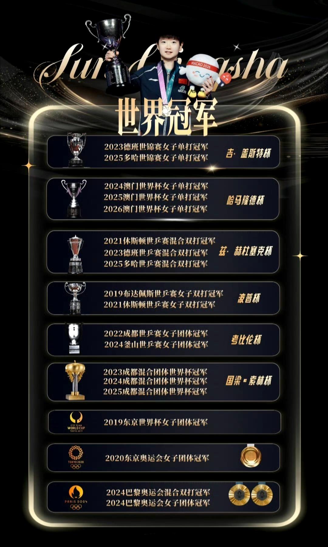 王楚钦孙颖莎 莎头组合 国乒双子星 世锦赛金满贯 双圈金满贯 乒乓球全满贯 莎头封神 国乒yyds 冠军荣誉墙