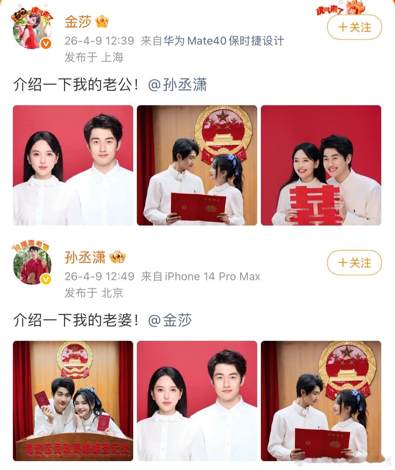 孙丞潇说很早就想和金莎结婚了,金莎也说孙丞潇很适合当老公,感觉孙没有那么多做作的假把式,不管年龄差距,还是希望他们能幸福久久。金莎孙丞潇领证