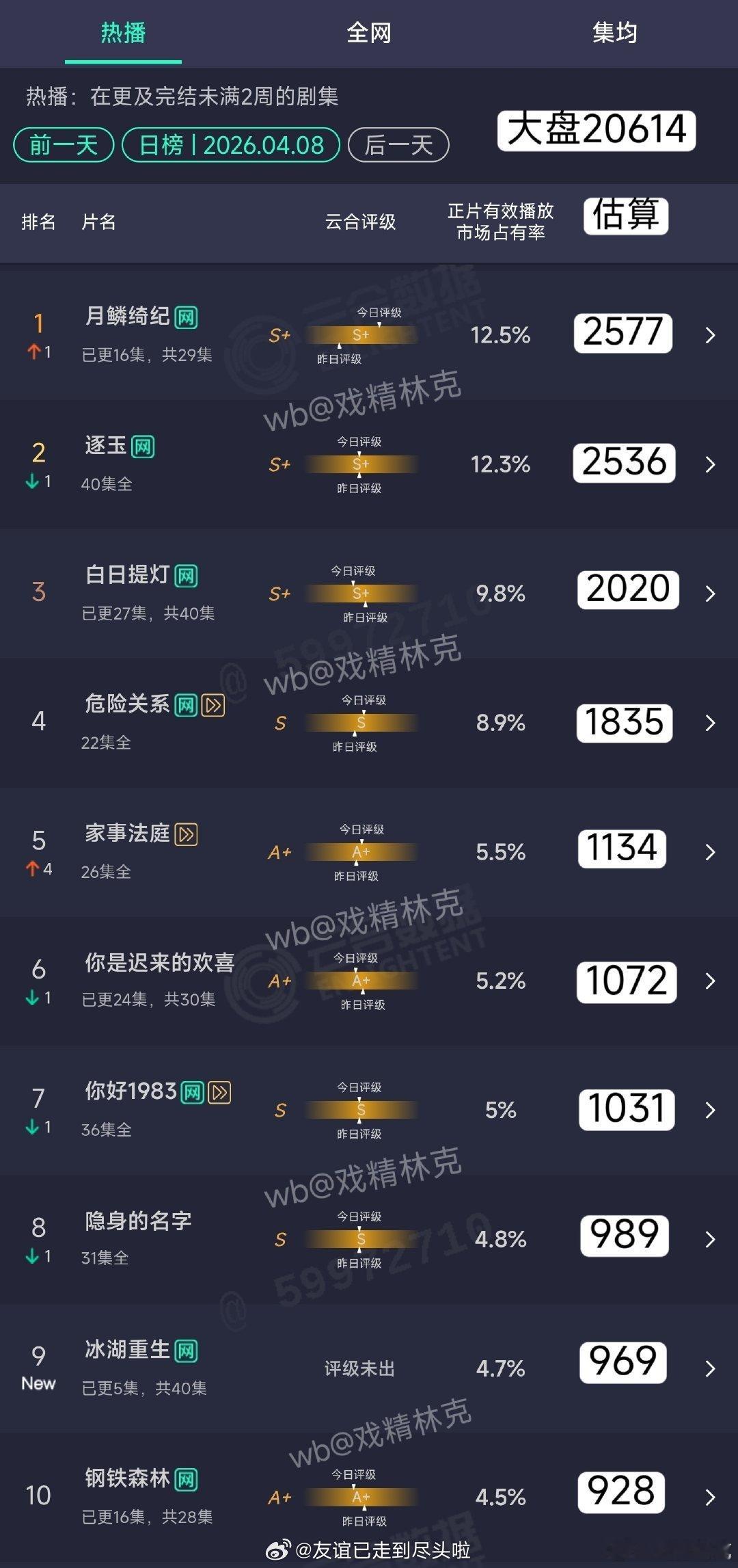 昨日电视剧热播期云合播放量排行榜《月鳞绮纪》顺利登顶,预估2577w《逐玉》第二,完结这么久还能12.3%,预估2536w《白日提灯 》9.8预估,2020w冰湖重生首日 预估969w+,中午开播,双平台固屏+专栏,这个成绩算扑开了