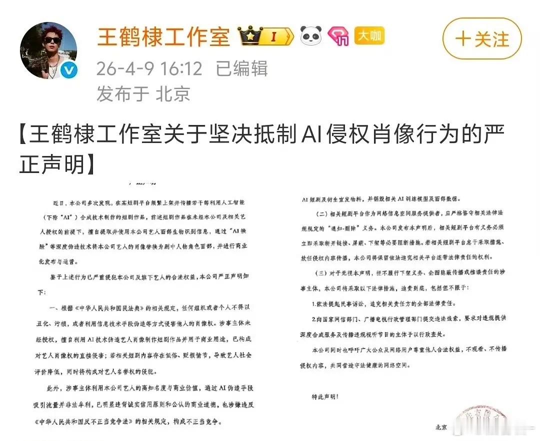 已经有8家明星发声抵制AI了杨紫,易烊千玺,邓为,龚俊,李沁,沈月,檀健次,王鹤棣但是短剧平台有的只是把近景给删了,这样不太好吧…