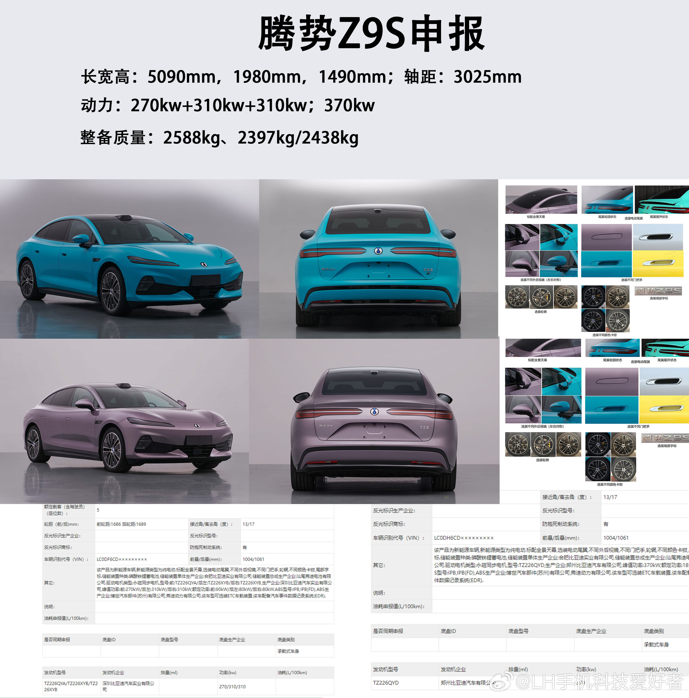腾势Z9S,车身尺寸为5090mm,1980mm,1490mm;轴距为3025mm。也是有三电机和单电机版本。三电机为270kw+310kw+310kw;单电机为370kw。