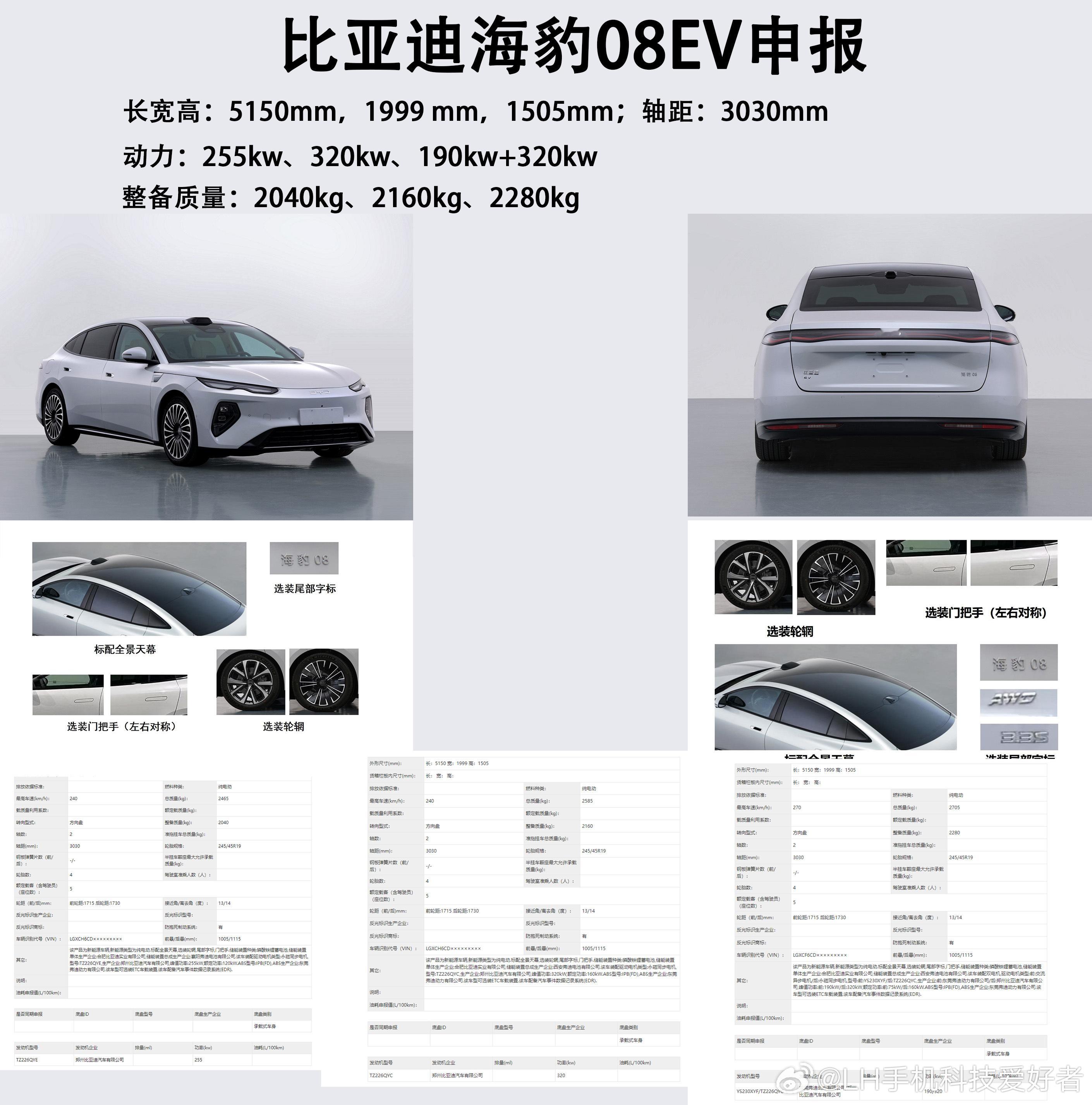 比亚迪海豹08 EV正式申报了,长宽高分别为5150mm,1999mm,1505mm;轴距3030mm。有单电机和双电机版本,单电机分别为255kw、320kw;双电机为190kw+320kw。