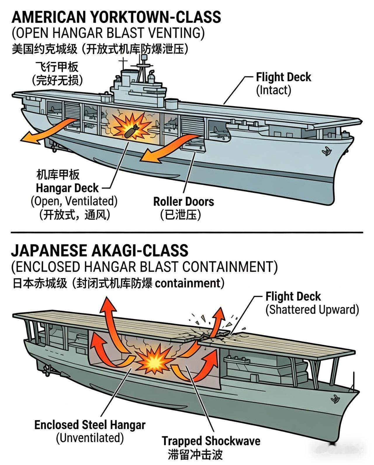 这张图直接揭开了太平洋战争中一个决定战局的致命设计缺陷:美军航母的开放式机库 vs 日军航母的封闭式机库,爆炸后的结局完全不同!