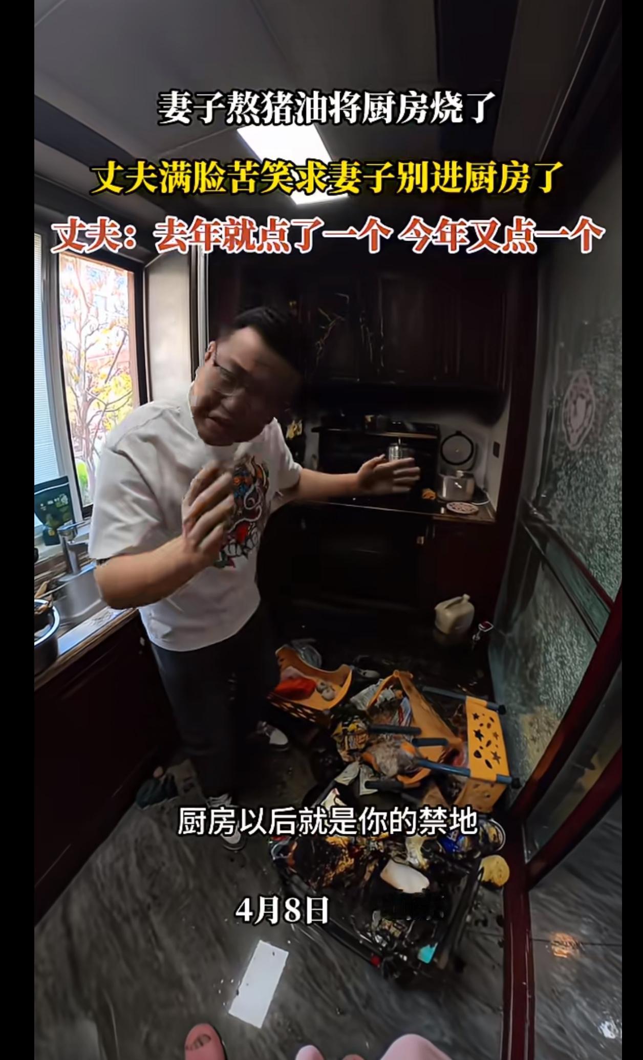 今年山东一个媳妇为了熬猪油,又进了一次厨房,又把厨房给烧了,丈夫哭笑不得的说,以后你别再进厨房了,去年因为熬猪油刚点了一次,今年又点了一次。