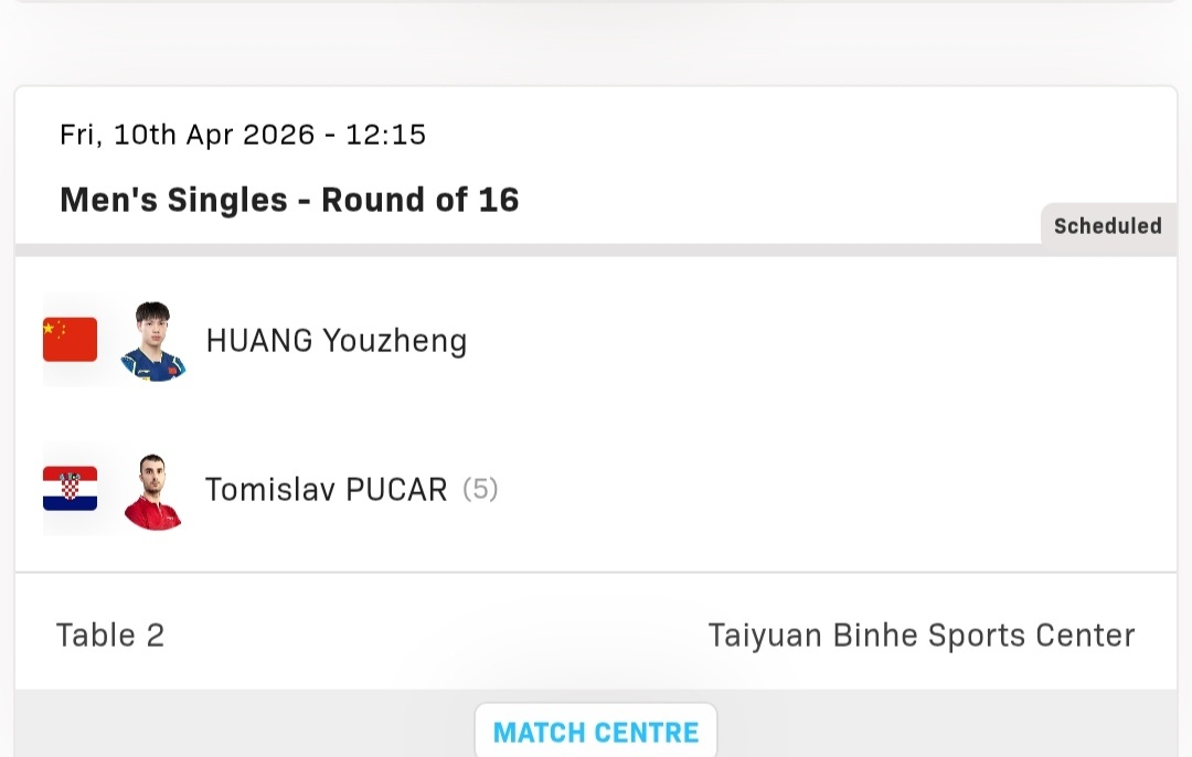 🔎男子单打方面⏰北京时间12:15💡球台:T2🏷男子单打1/8决赛🆚黄友政🇨🇳VS托米斯拉夫·普卡🇭🇷
