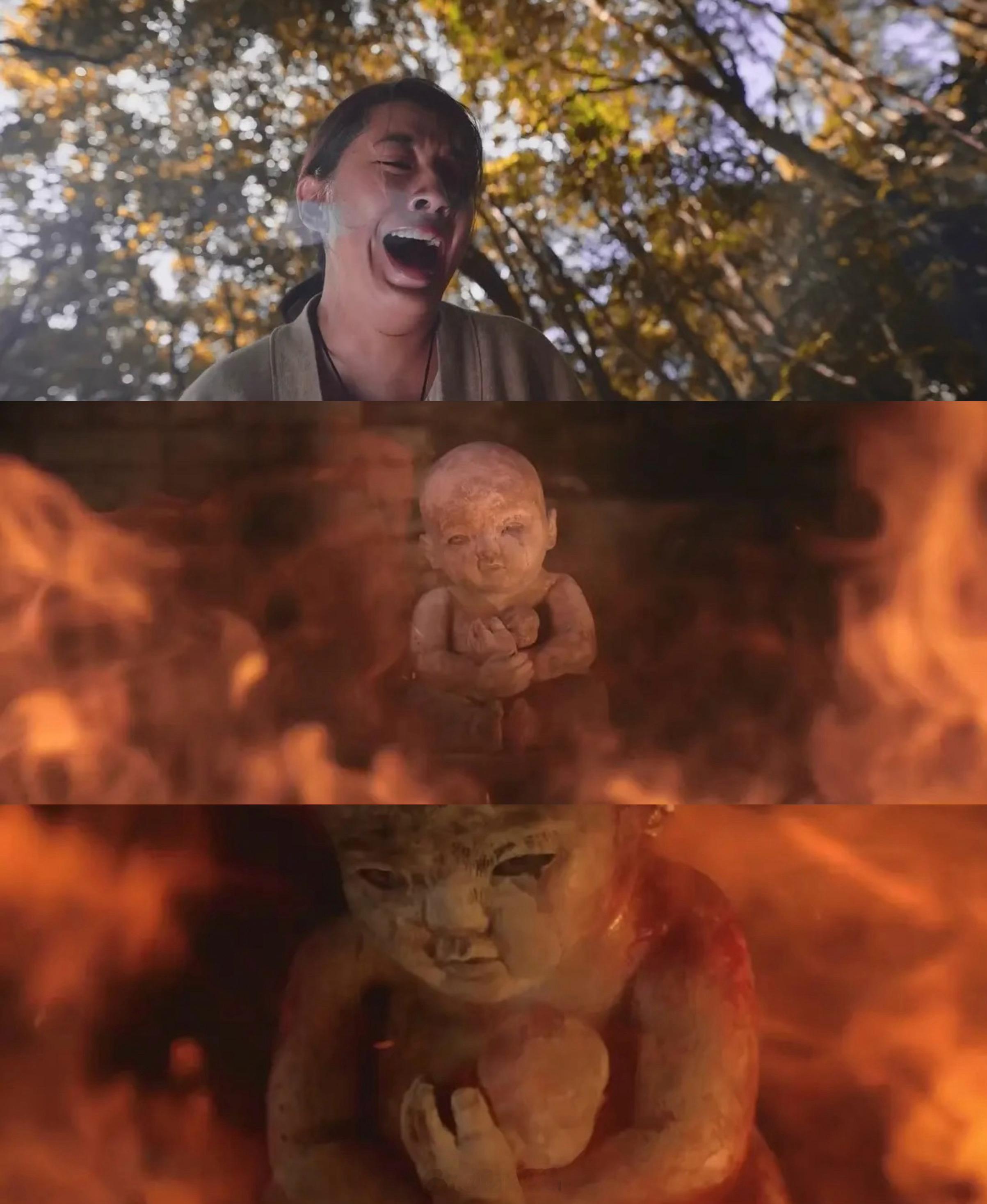 片中的慕华,原本是个文物修复师,独立自强、柔和又坚强,但怀孕后,却变得精神紧绷、爱疑神疑鬼、对丈夫也更频繁地叮嘱或斥责,这种因怀孕导致的变化,都被男方、男权,视为对传统规训下温柔好女人、好妈妈形象的叛离,甚至被异化为恐怖的源头……婴灵一下子就附体慕华了,借助她的身体展开毁灭,这无疑是对父权对女性进行母性神话塑造、又把不符合此标准的女性视为叛逆和异类的讽刺。