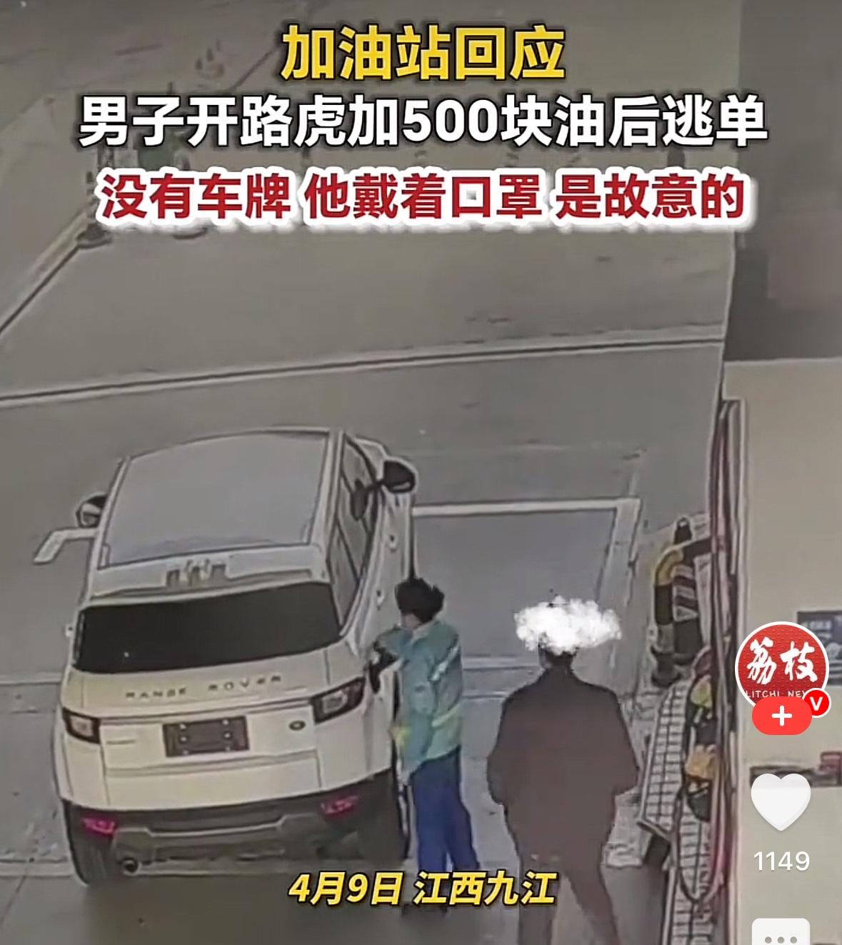林子大了,啥鸟都有!江西,一开路虎车的男子,在加油站加了500块钱的油,加完油后,他故意把服务员支开,说他上车就付款,结果,上车后却一脚油门加速逃走了,服务员追也没追上,最后只能报警。可监控录像中,男子全程戴着口罩,连车牌也卸了。服务员只好自认倒霉说:气死了,这500块钱得自己认!