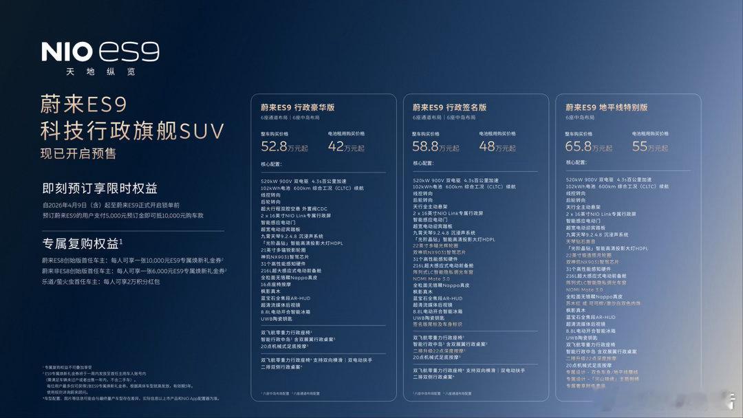 ES9行政豪华版预售价528,000元起,采用BaaS电池租用方式购买,预售价420,000元起;