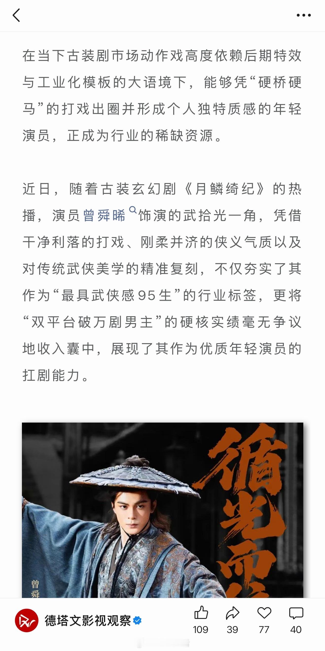 德塔文发文,双平台破万剧男主曾舜晞:拾光而上,以“武”突围