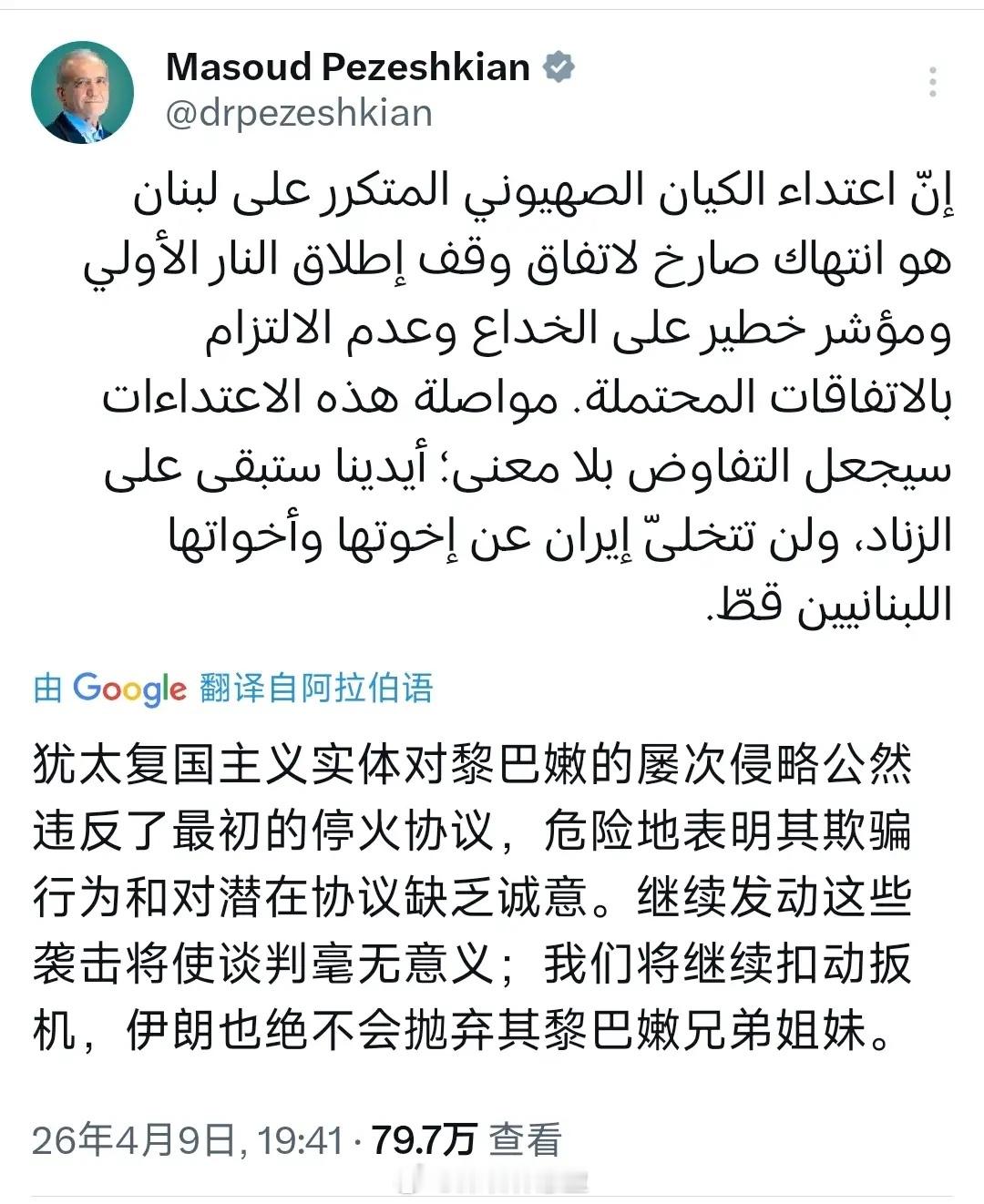 “犹太复国主义实体对黎巴嫩的屡次侵略公然违反了最初的停火协议,危险地表明其欺骗行