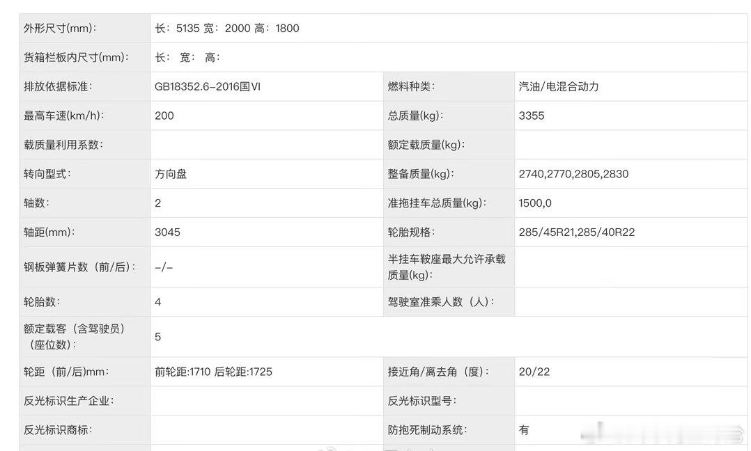 长:5135 宽:2000 高:1800,轴距 3045 mm,长宽轴距比上一代略微提高。此次只推出五座版,电池是欣旺达和理想。理想L8