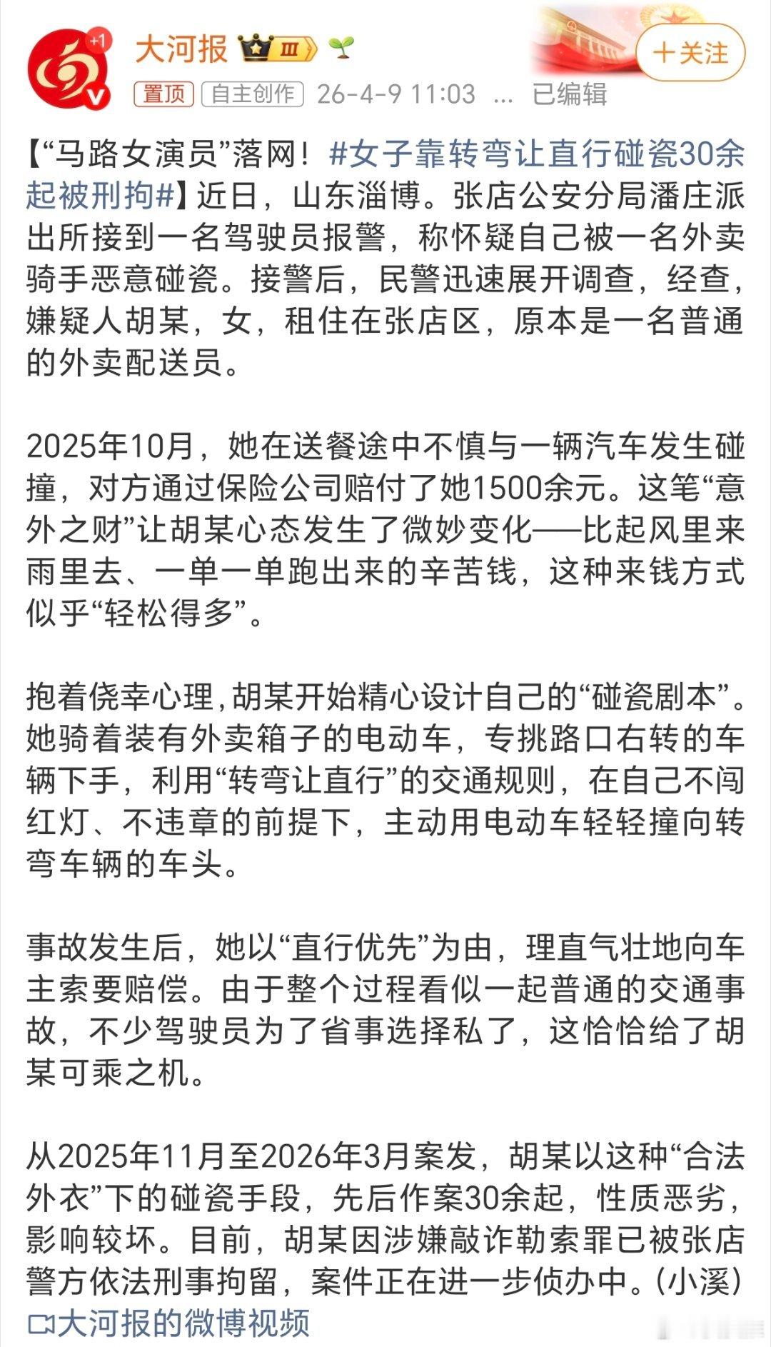 女子靠转弯让直行碰瓷30余起被刑拘常在河边走哪有不湿鞋?该女子碰瓷碰惯了,只要遇