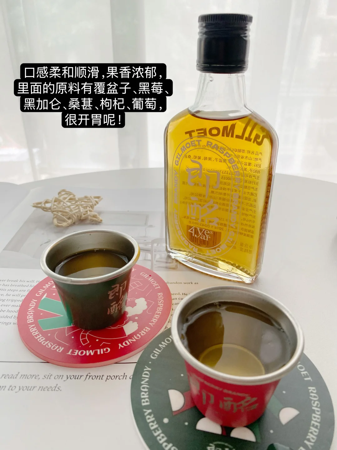 倒上一杯小酌一口,入口的口感柔和顺滑,果香浓郁,里面的原料有覆盆子(别称-树莓)、黑莓、黑加仑、桑葚、枸杞、葡萄,很开胃!
