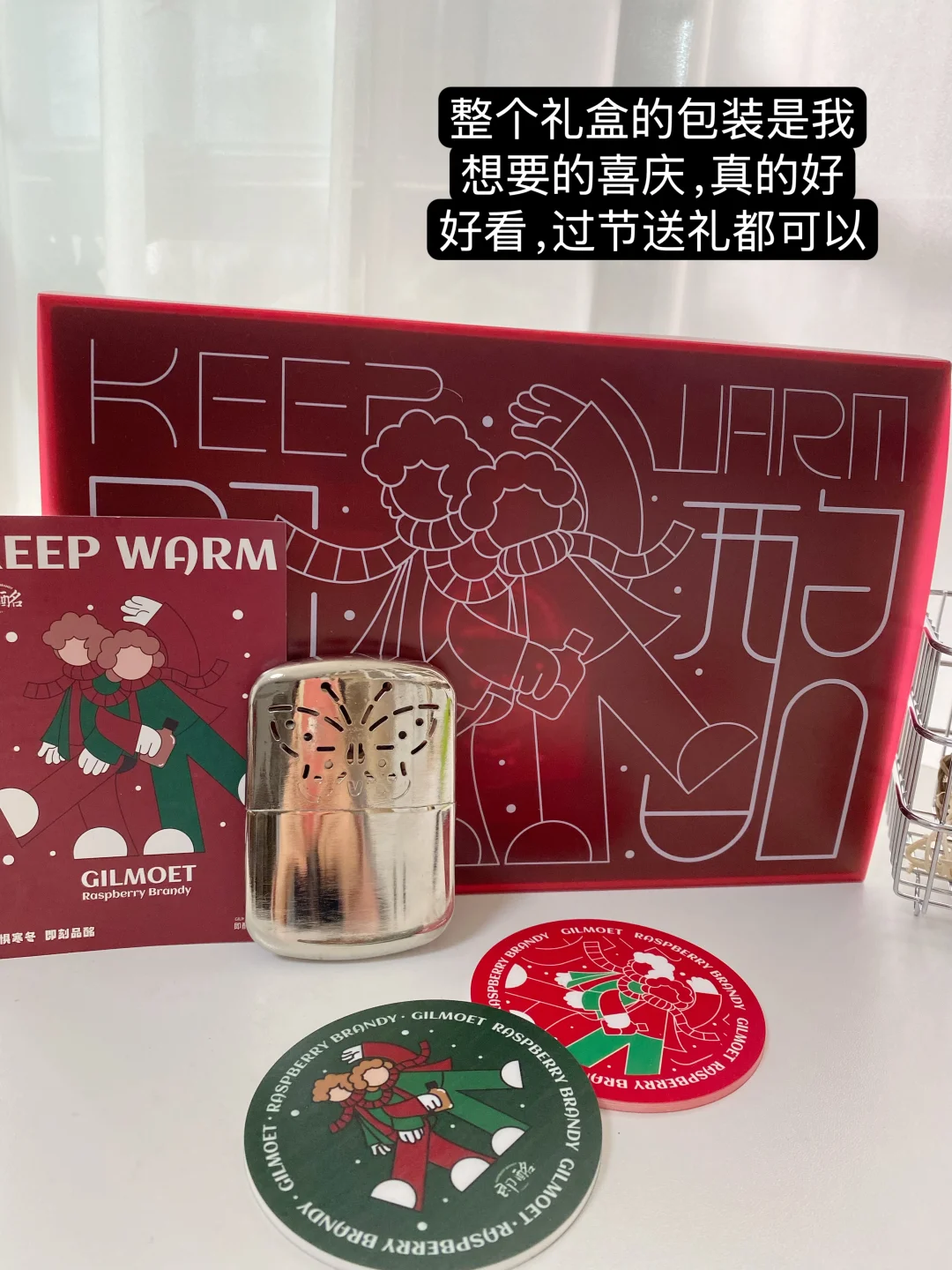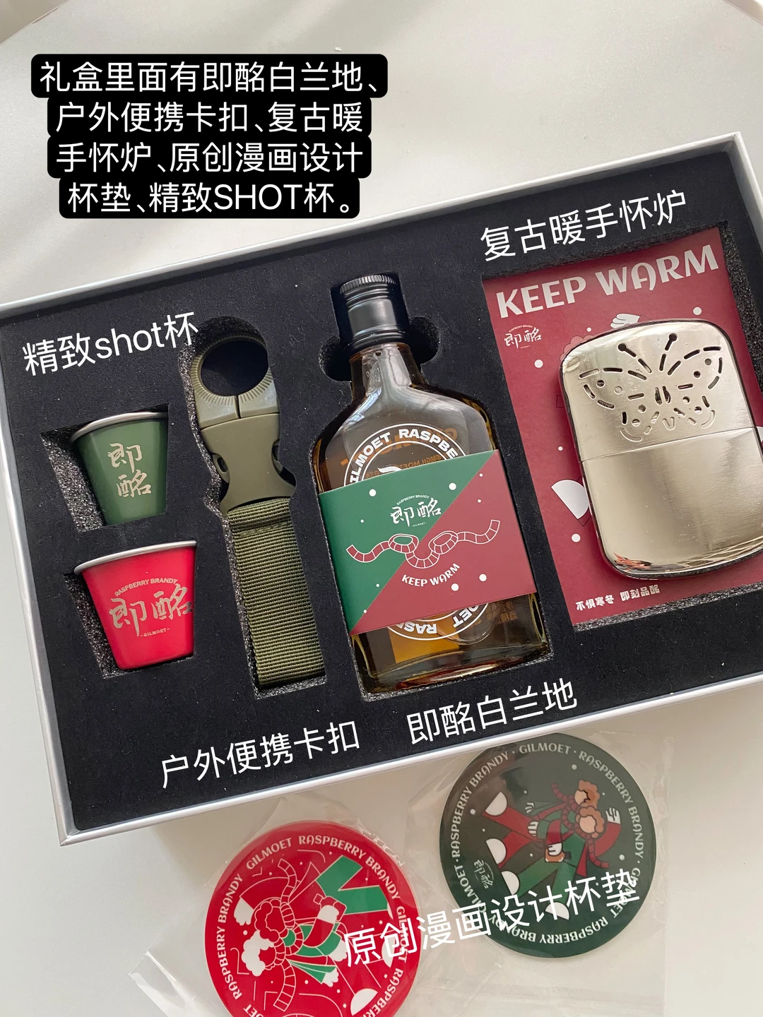 礼盒里面有即酩白兰地、户外便携卡扣、复古暖手怀炉、原创漫画设计杯垫、精致SHOT杯。假期外出露营、游玩的时候也可以用得上,性价比真的很高。