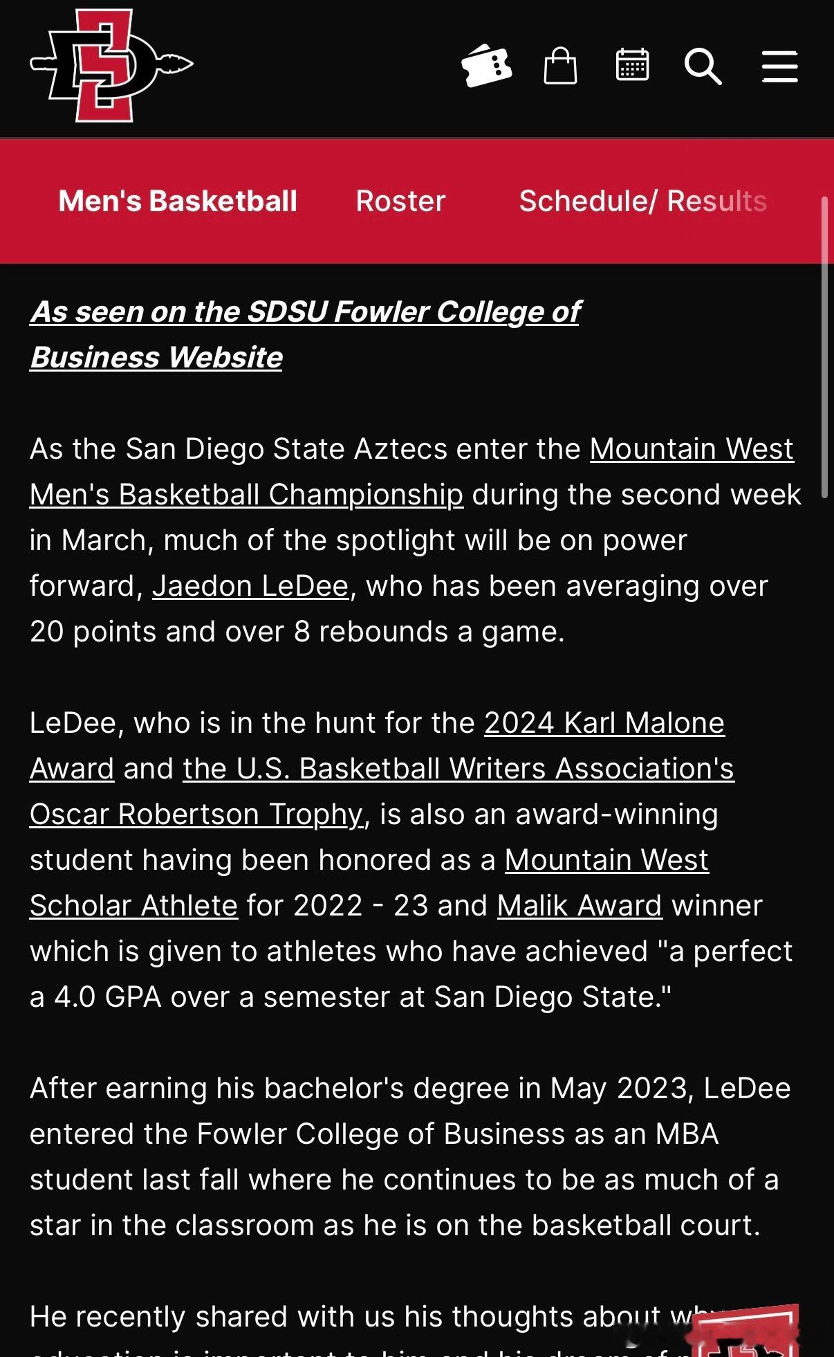 随着圣地亚哥州立大学(SDSU)男篮在三月第二周进入山地西部联盟锦标赛,外界的关注将主要集中在大前锋杰登·勒迪身上——他本赛季场均超过20分、8个篮板。