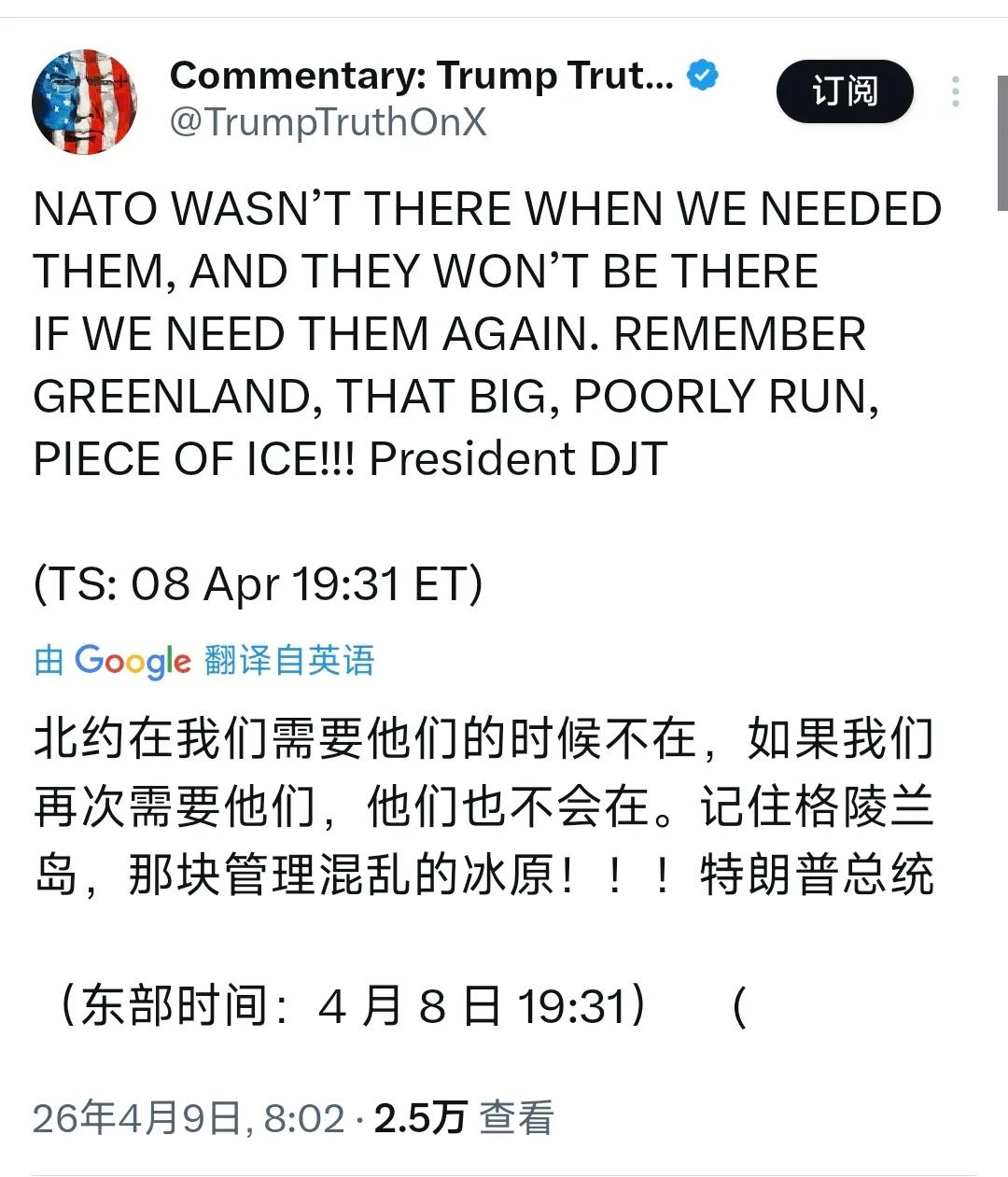 见到吕特,特朗普更是愤恨交加,他今天(4月9日)写道:“北约在我们需要他们的时候不在,如果我们再次需要他们,他们也不会在。记住格陵兰岛,那块管理混乱的冰原!!!”