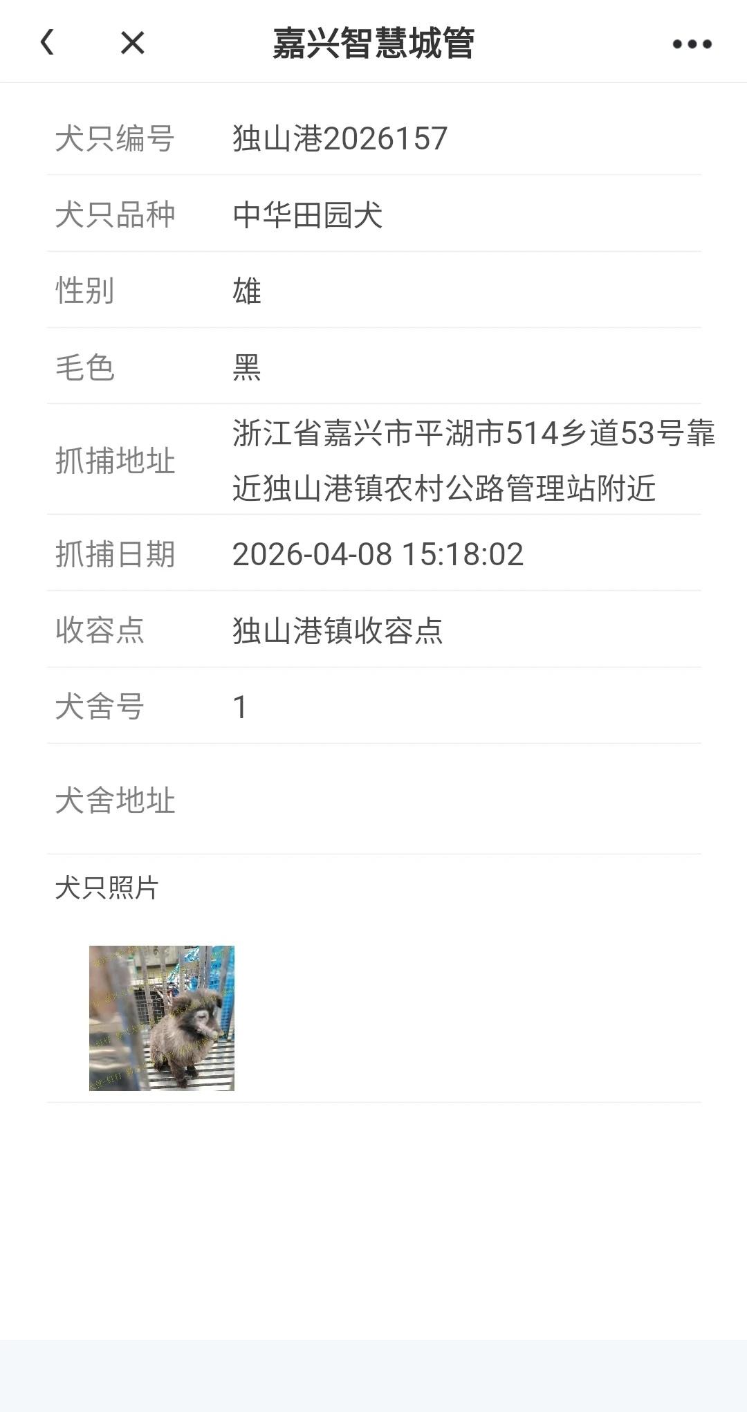 浙江浙里办嘉兴(平湖市)2026.4月8犬只公示 嘉兴平湖寻狗 平湖1只,抓捕地
