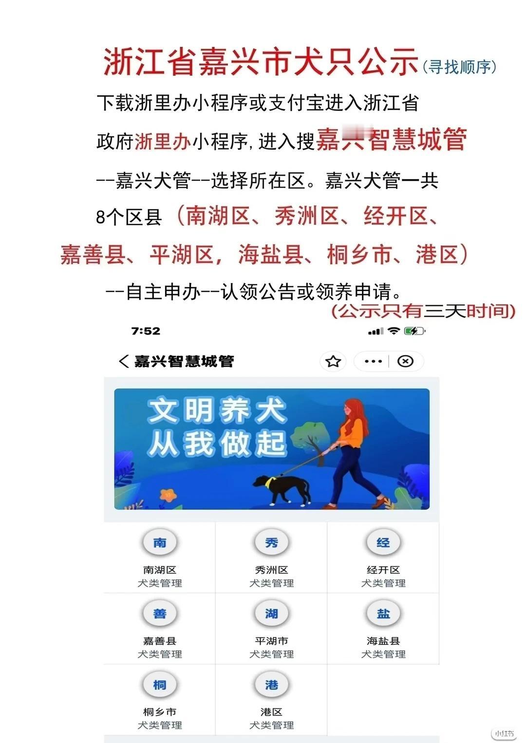 嘉兴平湖市找狗进入浙里办小程序或某宝也可以找到,搜索找到嘉兴智慧城管~嘉兴犬管~选择平湖市~自主申办~认领公告。浙江省嘉兴市寻狗 平湖市 嘉兴平湖寻狗启示 平湖寻狗 平湖独山港镇寻狗 浙江嘉兴平湖市犬留所