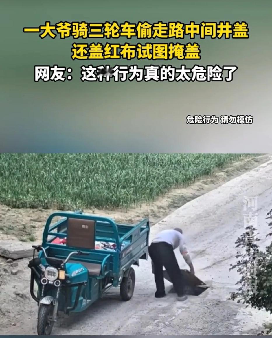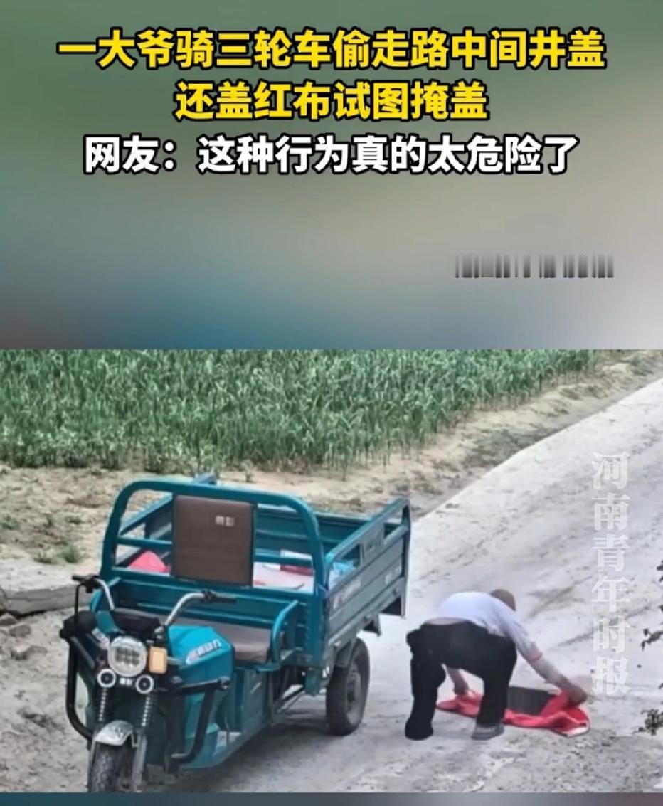 太缺德!吉林,大爷骑三轮车在路上,发现路中央有铁盖板。他直接将铁盖板搬到车上,又从车上拿出一块红布盖到井口,没想到,红布又小又薄,根本遮不全井口,只勉强盖住了一小半,可大爷却扬长而去。