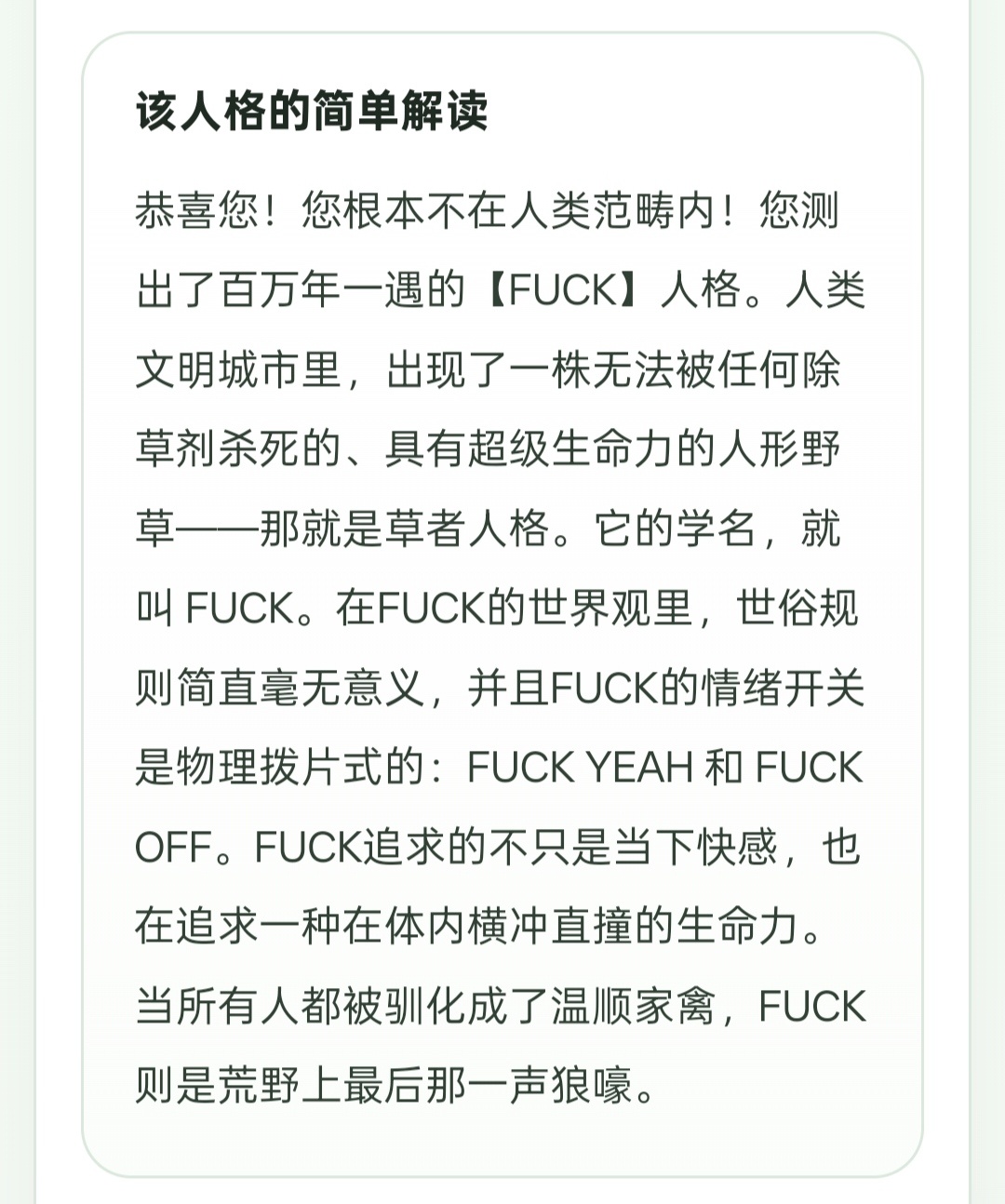 深夜测这个真的要笑死了,很准,特别是展开里那句我的自信是随天气波动的,顺风能飞,逆风先缩。测sbti要笑晕了sbti
