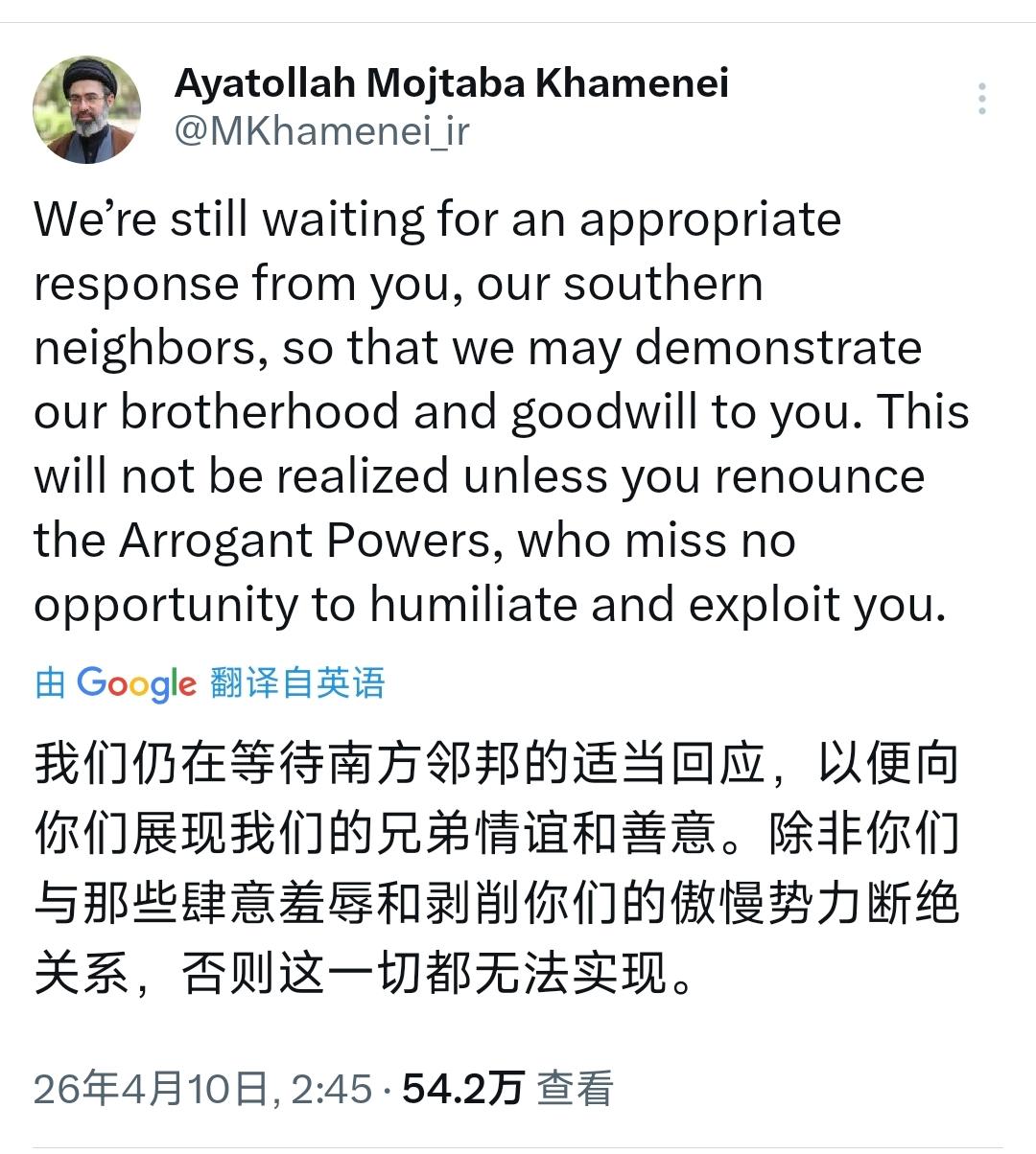伊朗最高领袖穆杰塔巴·哈梅内伊今天(北京时间4月10日)写道:“我们仍在等待南方邻邦的适当回应,以便向你们展现我们的兄弟情谊和善意。除非你们与那些肆意羞辱和剥削你们的傲慢势力断绝关系,否则这一切都无法实现。”