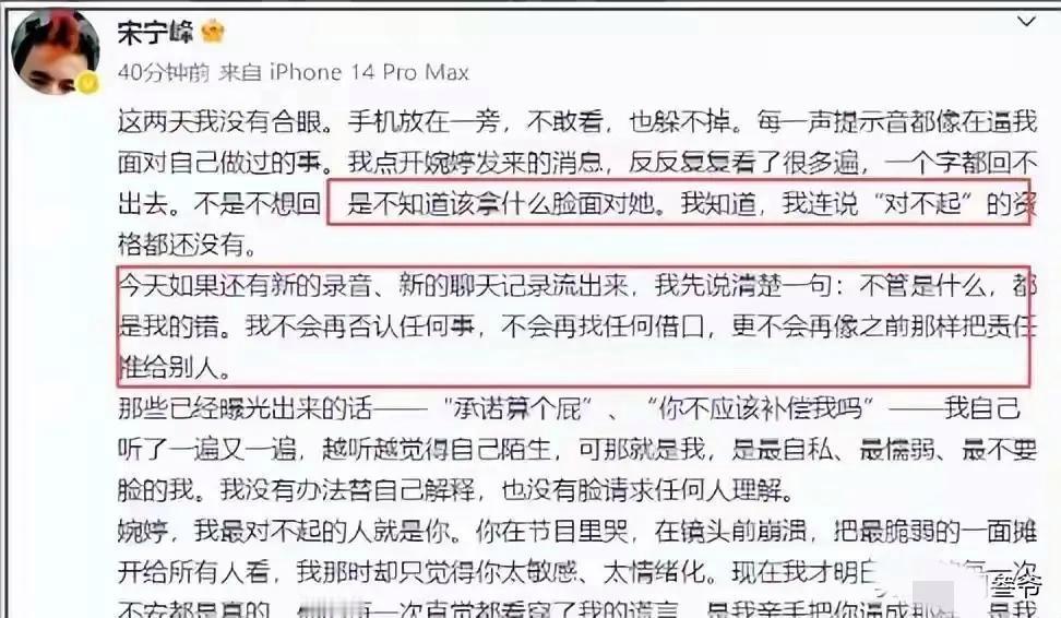 2026年3月底,据爆出的录音与聊天记录,宋宁峰在妻子怀二胎仅半年时出轨圈外女士“Q小姐”。录音中他承认主动勾引,甚至被曝带年幼女儿与女方约会。4月1日,他又发长文承认“自私、不要脸”,并宣布无限期暂停演艺工作。但道歉前夜仍被拍到与出轨对象密会,被批是“伪悔过”。