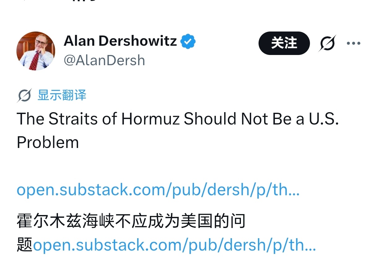 美国法学泰斗德肖维茨急了,发文称:如果伊朗对部分船只关闭霍尔木兹海峡,美国也应如此对待所有船只。