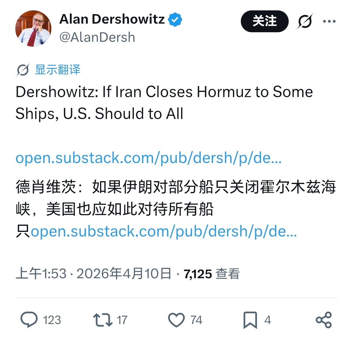 美国法学泰斗德肖维茨急了,发文称:如果伊朗对部分船只关闭霍尔木兹海峡,美国也应如