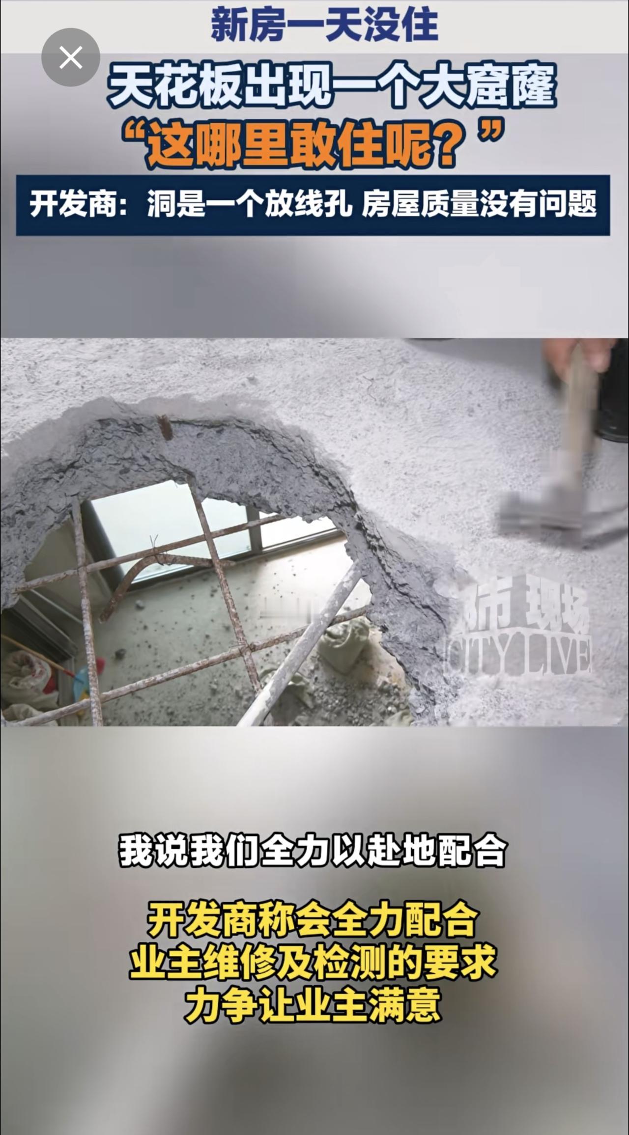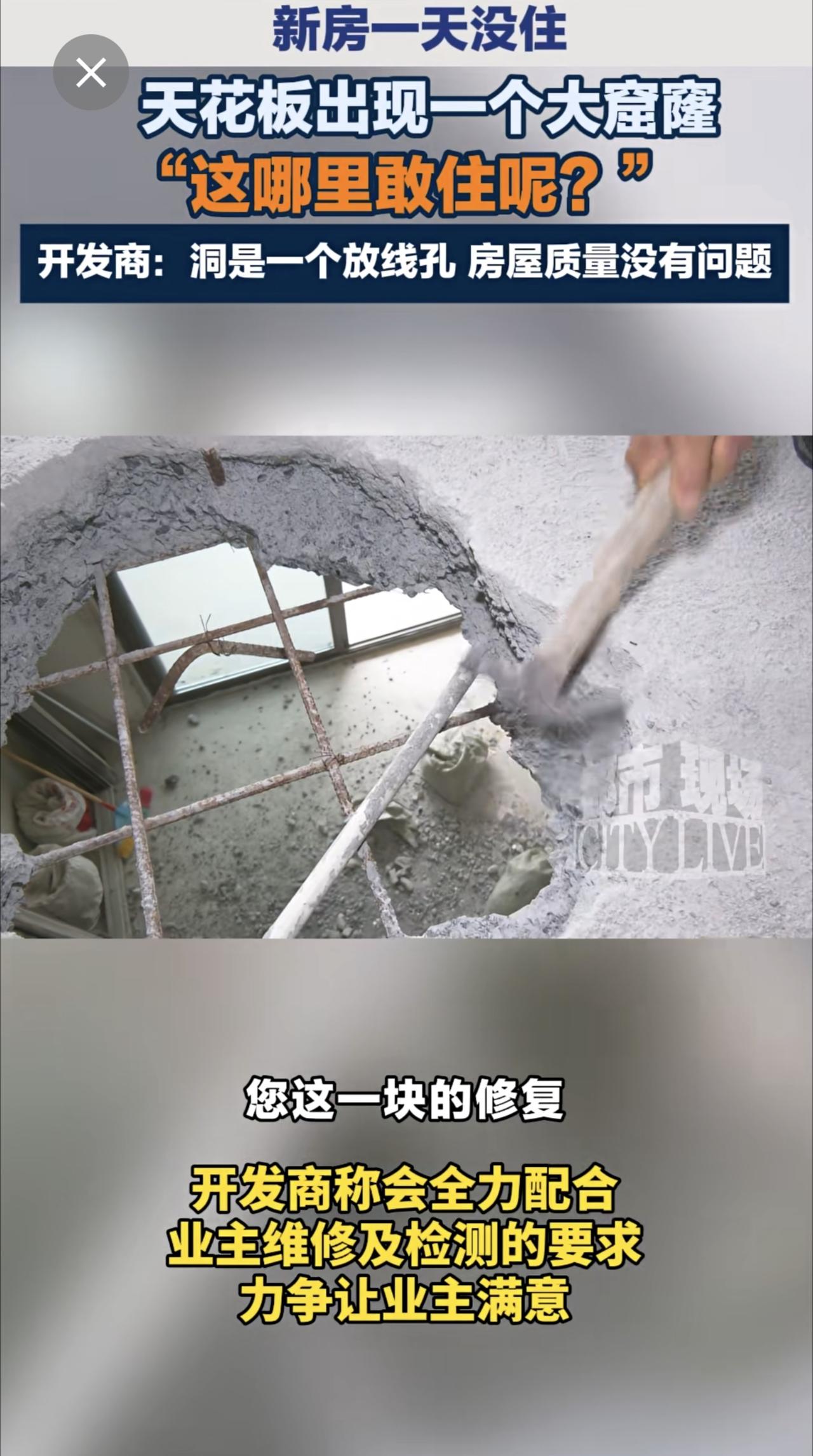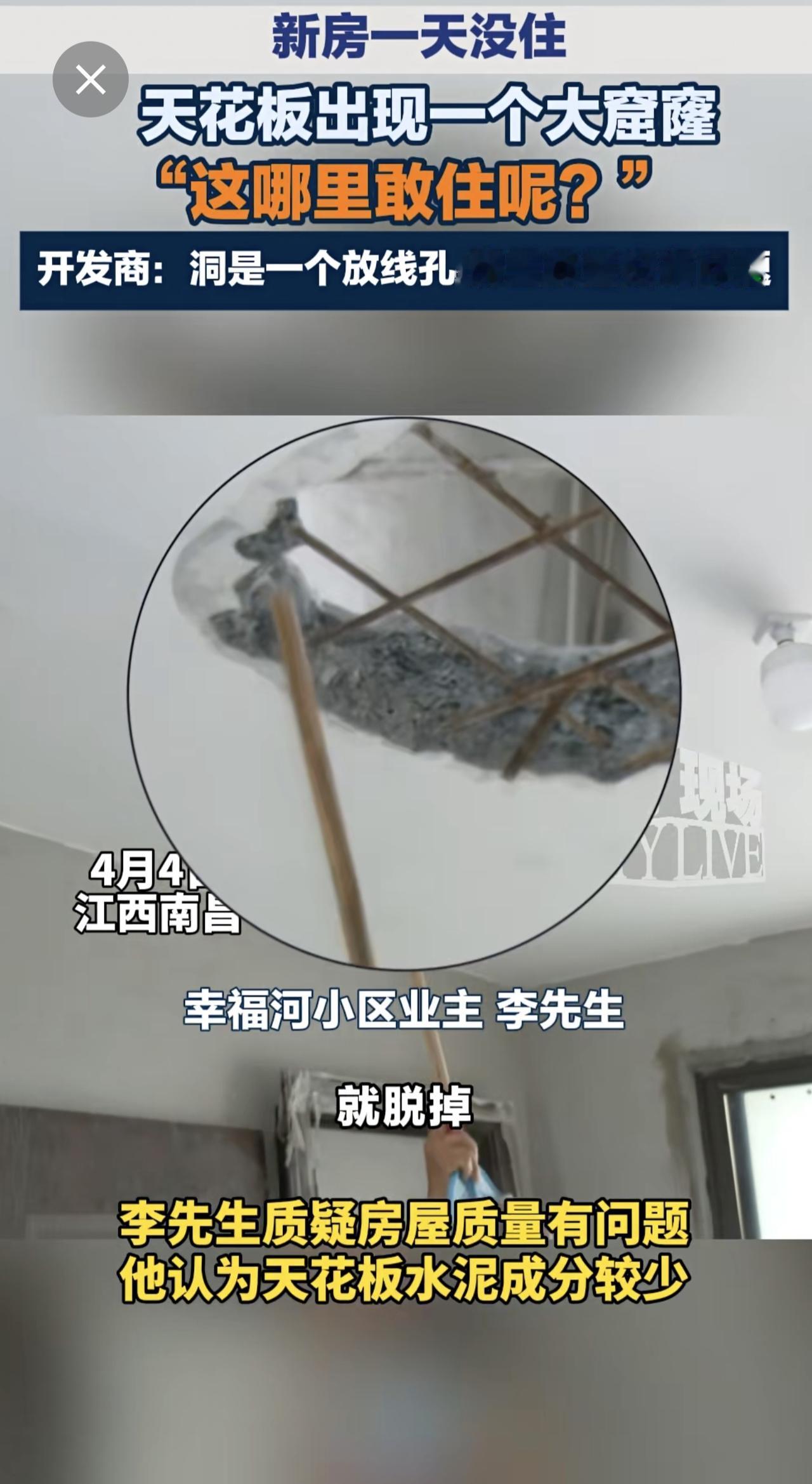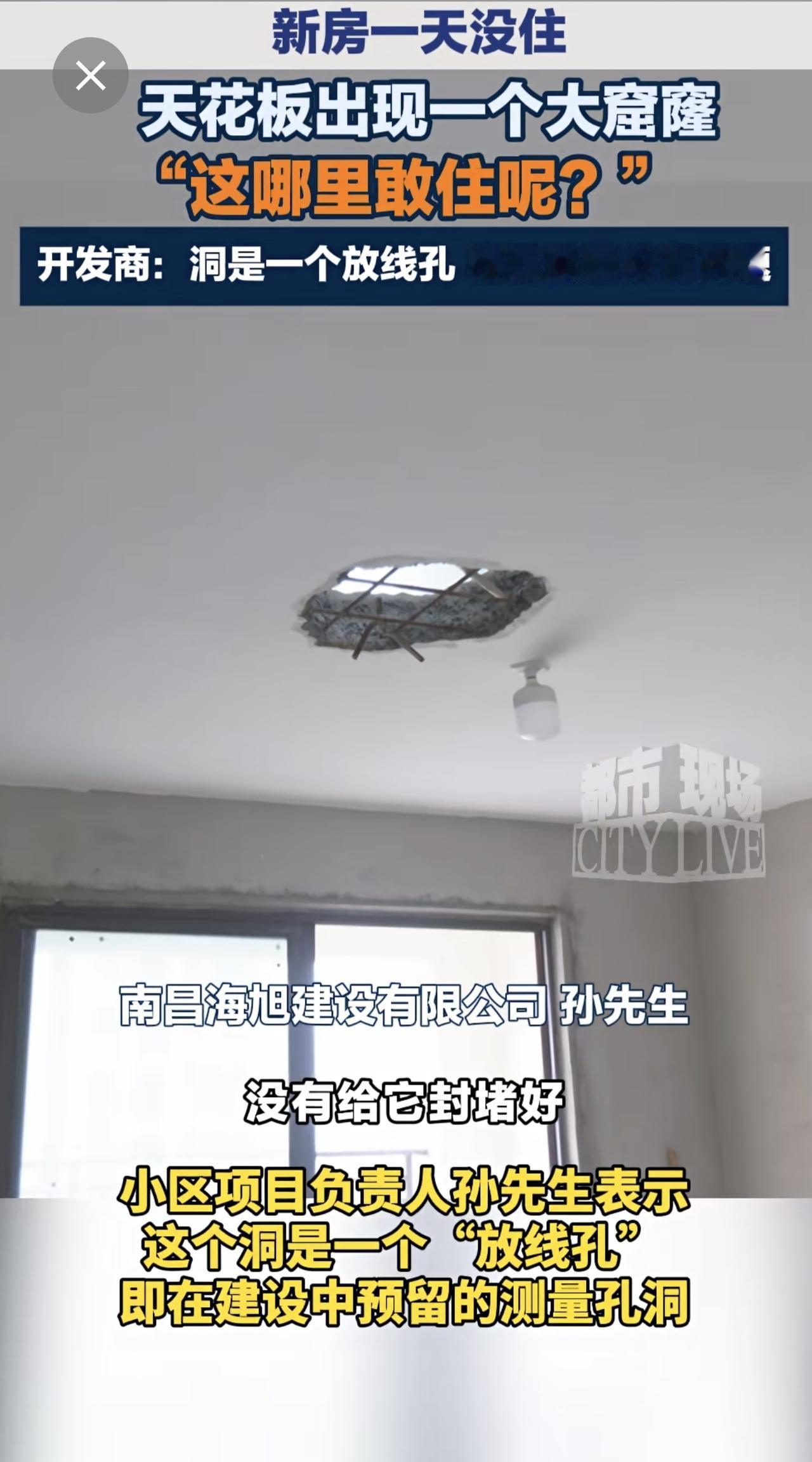 新房未入住天花板脱落 露大窟窿业主不敢住 开发商回应:系“放线孔”未封堵好 房屋