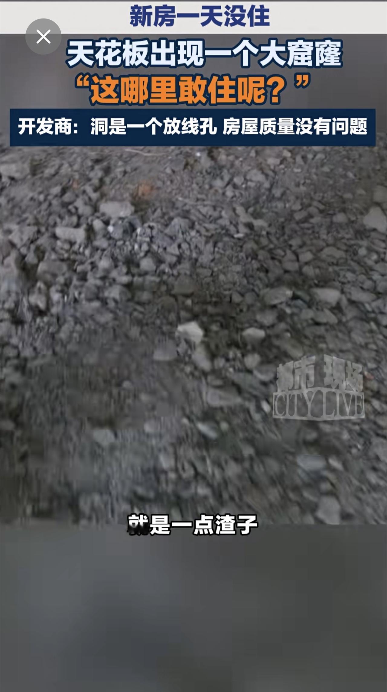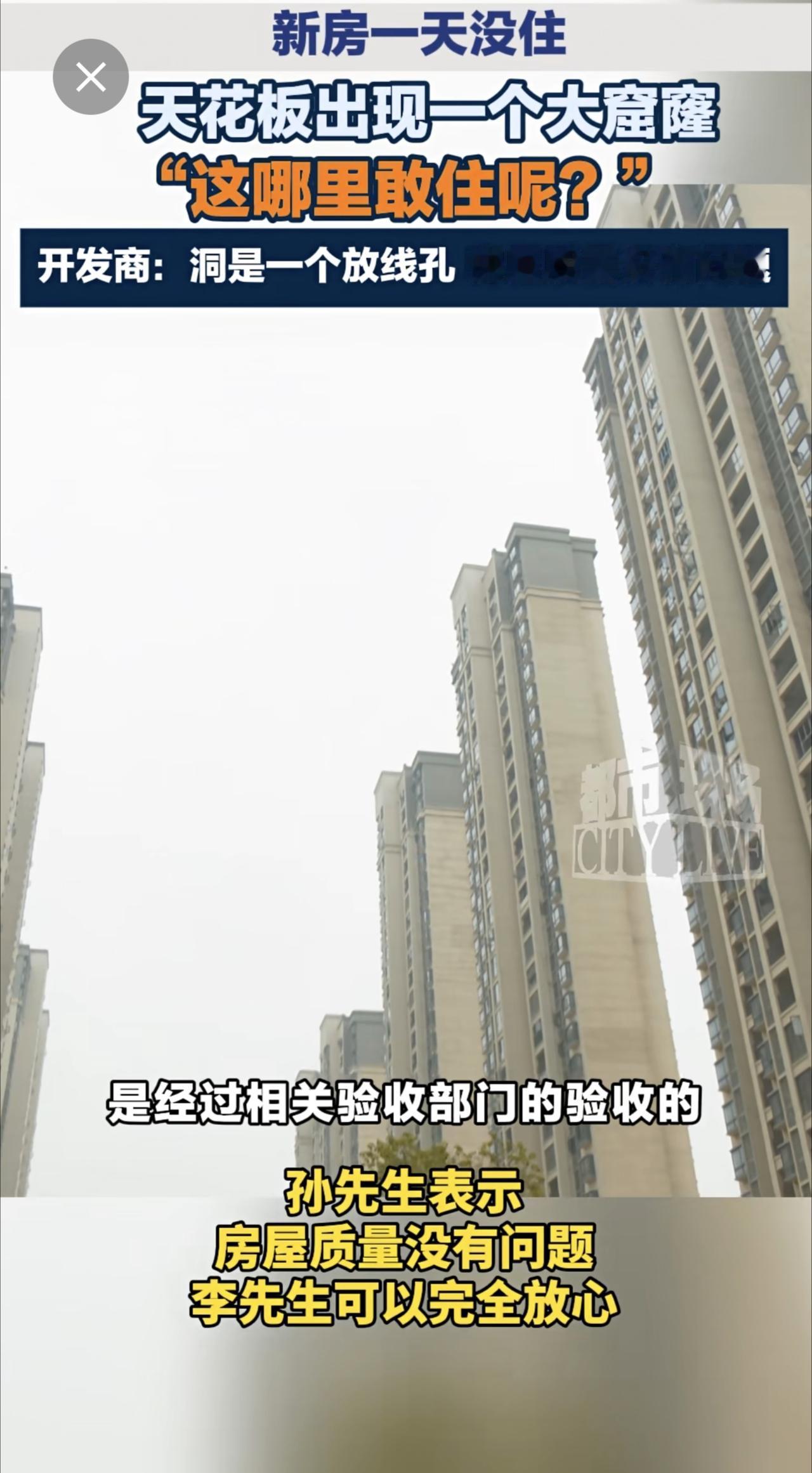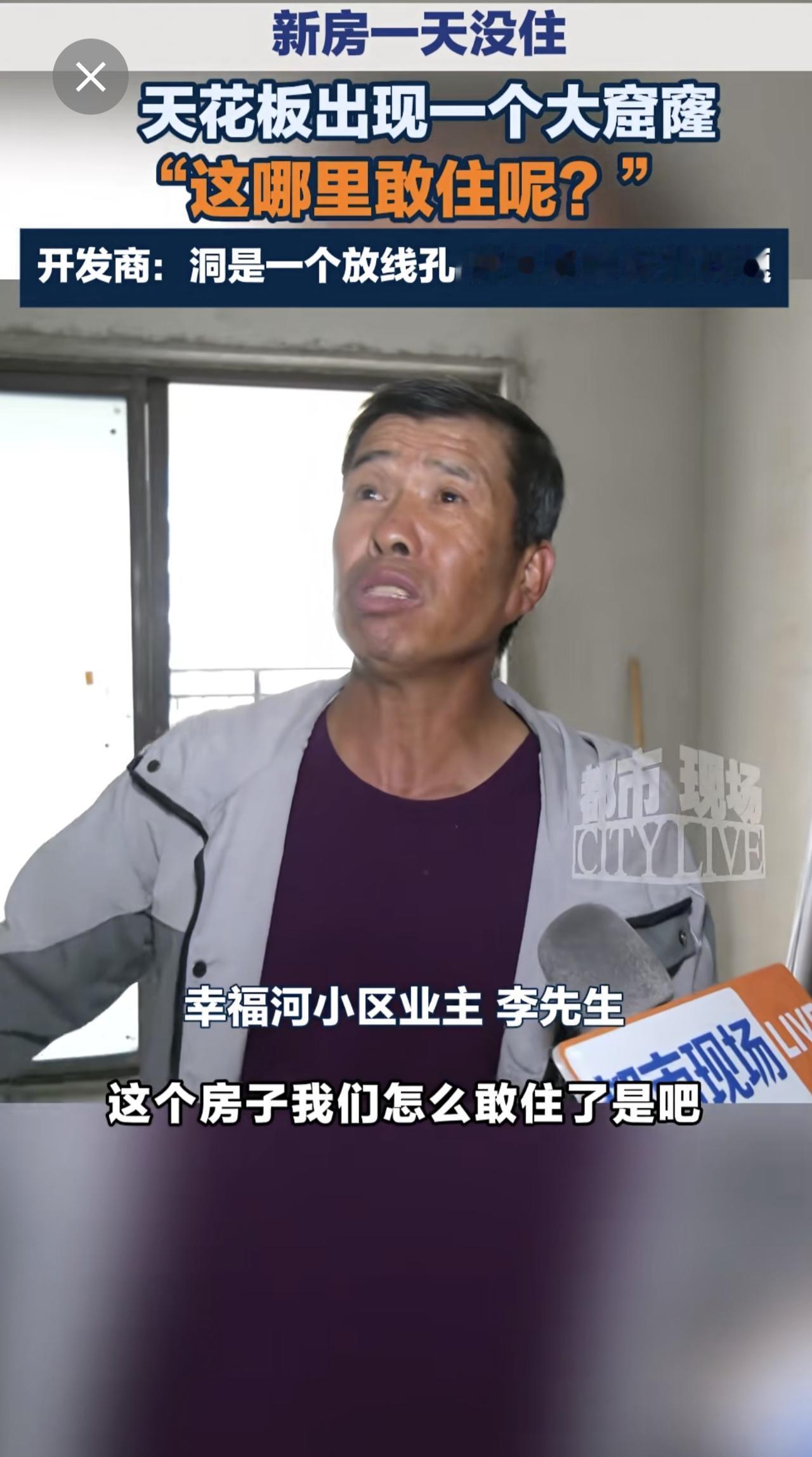新房未入住天花板脱落 露大窟窿业主不敢住 开发商回应:系“放线孔”未封堵好 房屋