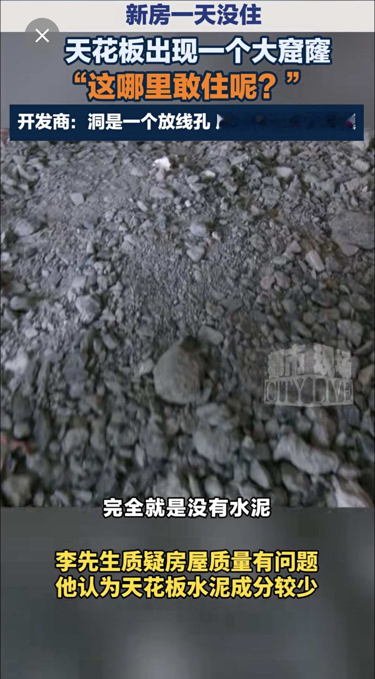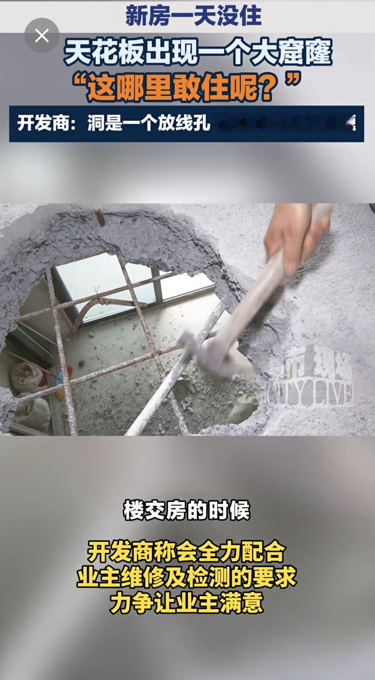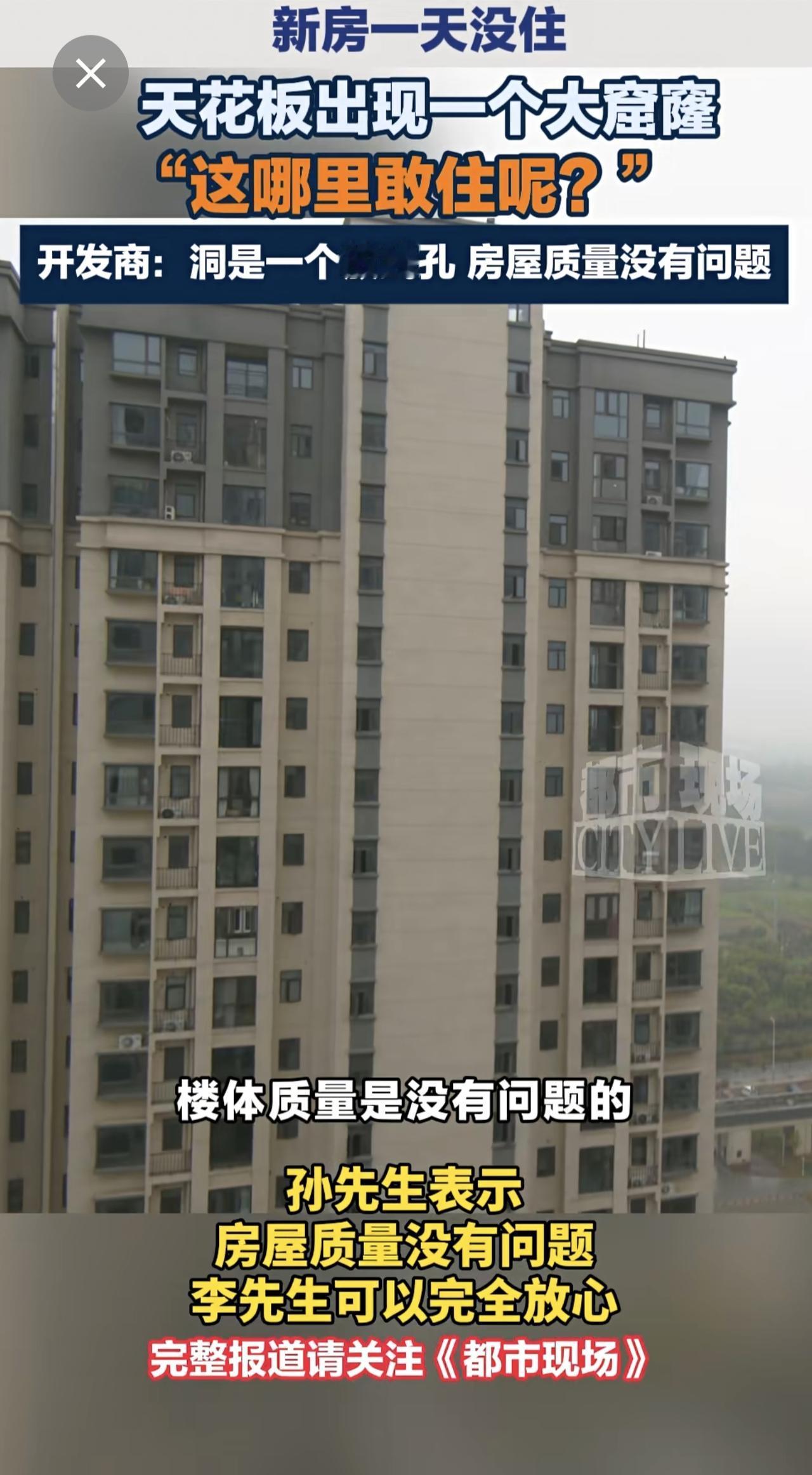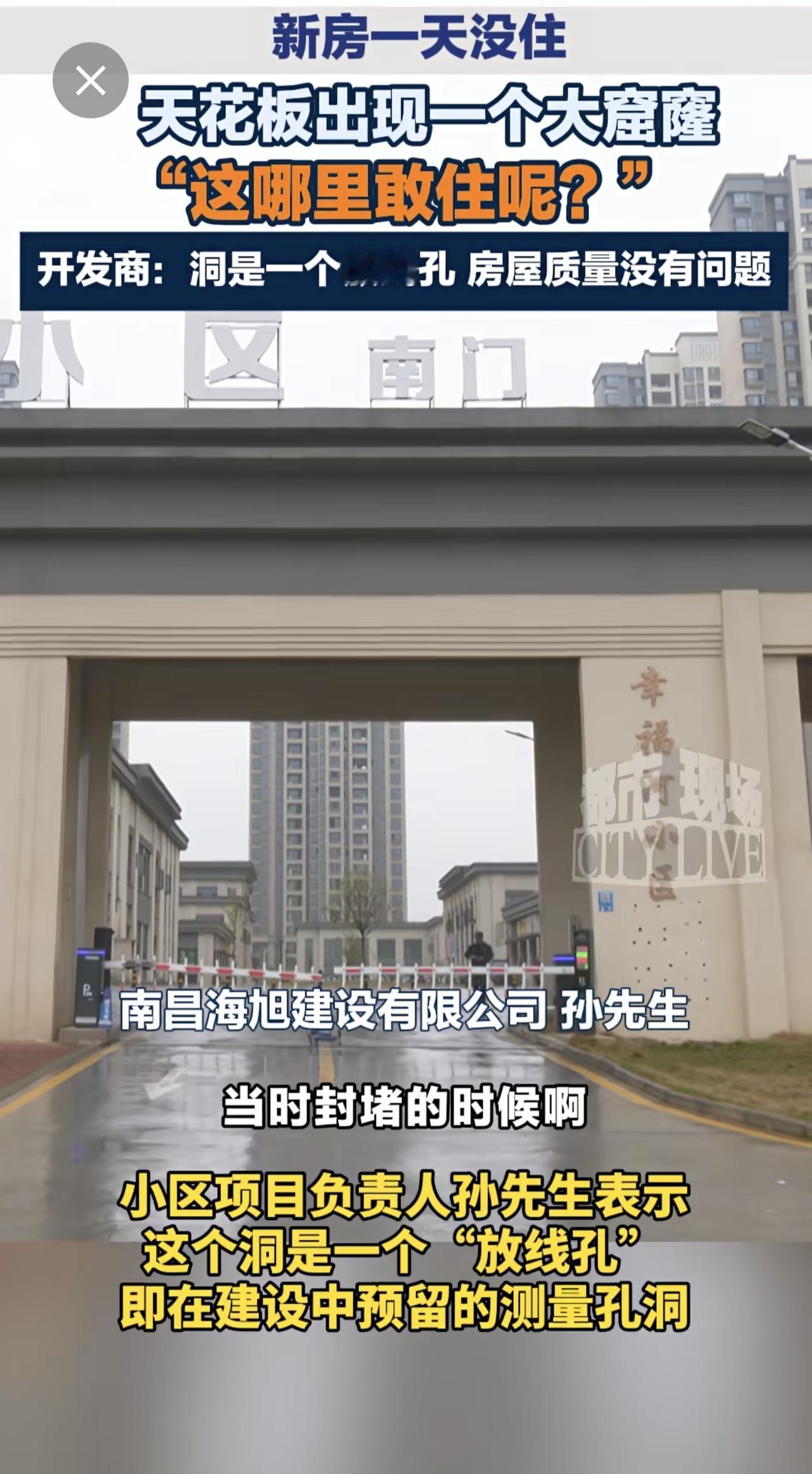 新房未入住天花板脱落 露大窟窿业主不敢住 开发商回应:系“放线孔”未封堵好 房屋