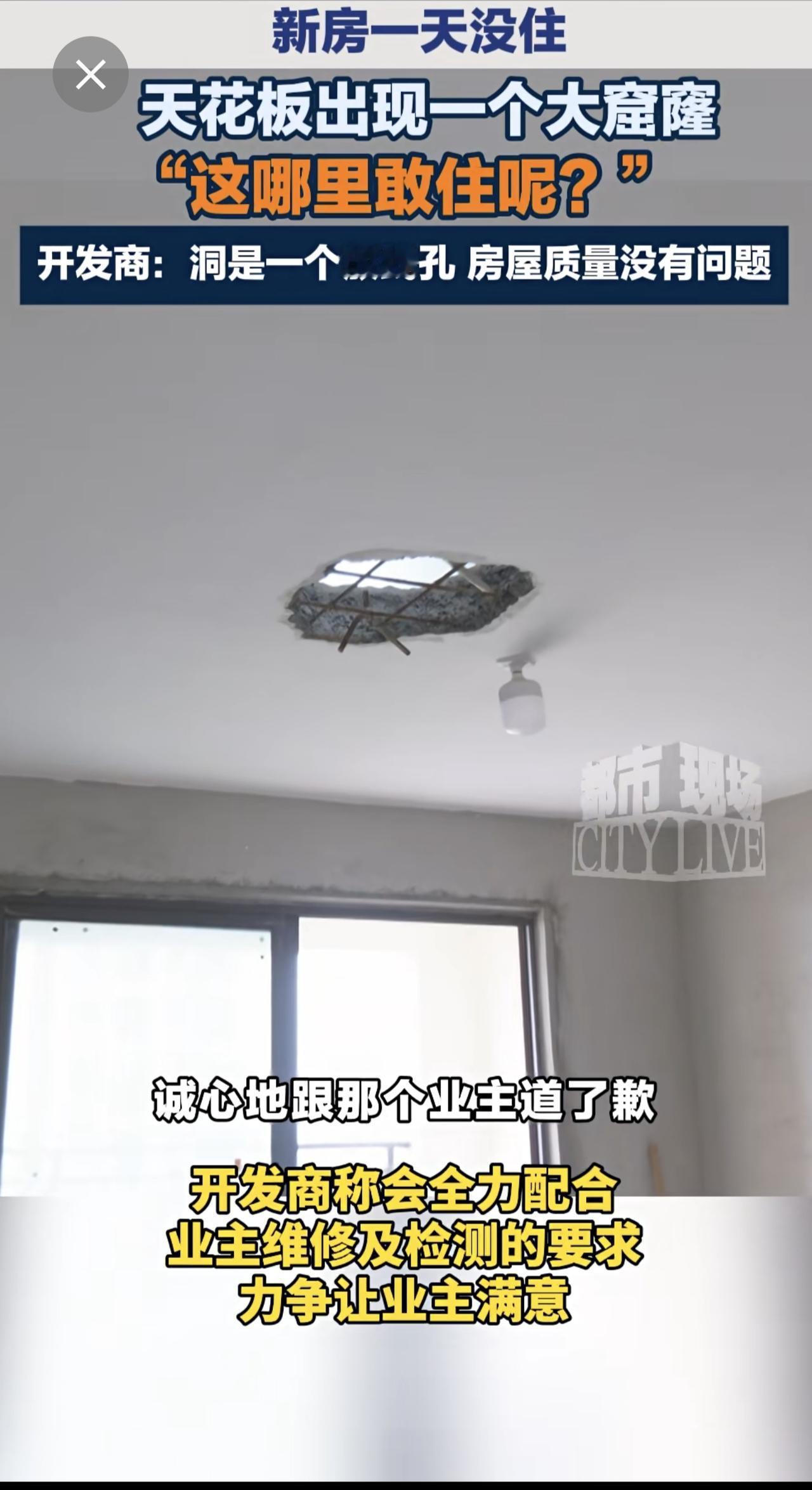 新房未入住天花板脱落 露大窟窿业主不敢住 开发商回应:系“放线孔”未封堵好 房屋质量没有问题