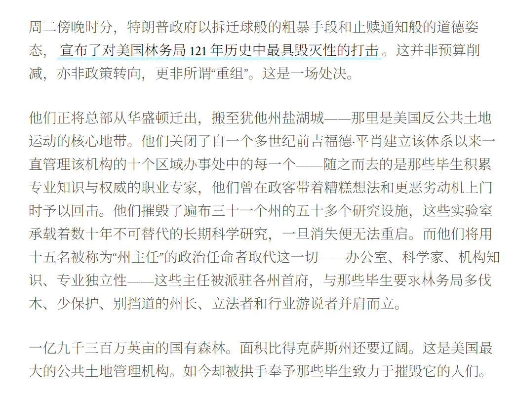 特朗普政府已宣布计划解散美国农业部下属的美国林务局(US Forest Service, USFS),包括迁出总部(从华盛顿迁出,搬至犹他州盐湖城)、拆解总部架构、瓦解区域体系,并摧毁美国林业组织的科研支柱。