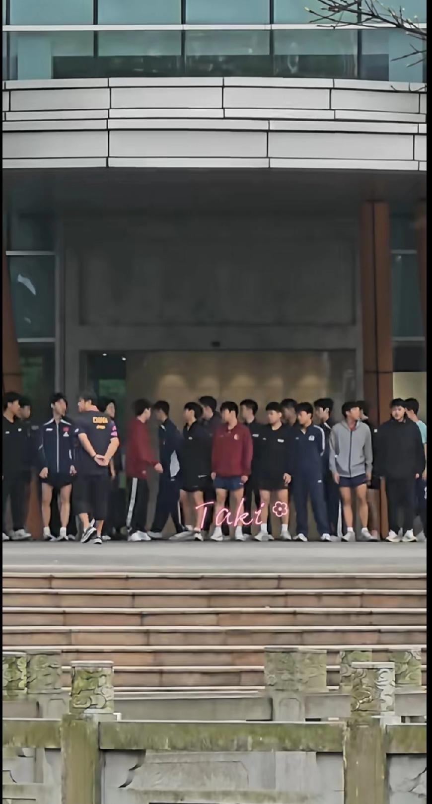 一开始队员们三三两两、急急忙忙往台阶上赶,你追我赶,活脱脱就是赶早八的我们,太真实了!教练背着手一站,瞬间化身“班主任”,乱糟糟的队伍立马归位,最后整整齐齐站成两排,氛围感直接拉满。