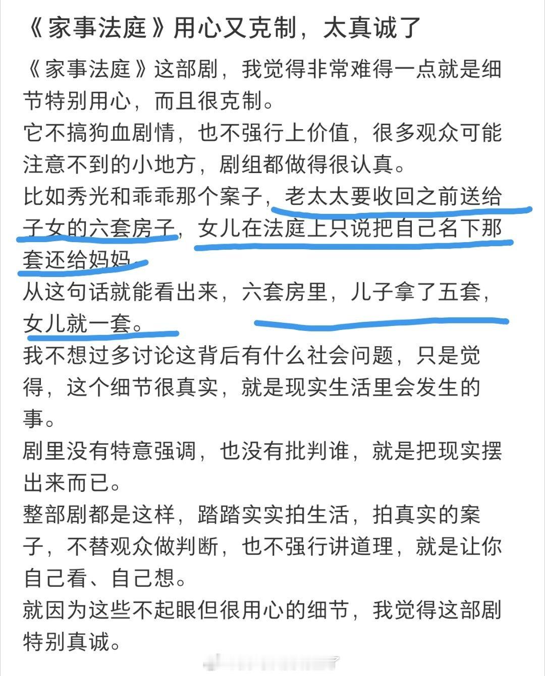 《家事法庭》真的好现实耶好细节,现实到都没刻意把这些地方单独拿出来做矛盾点,还有柳阿姨的案子,养父母的案子,不去上高度,剧里就把现在实际情况给你看,你可以光看表面,也可以根据现状去思考更深一层东西。家事法庭
