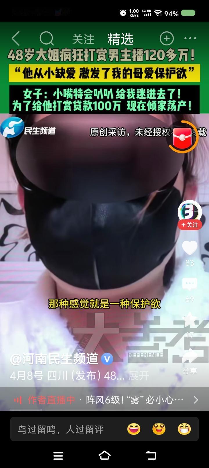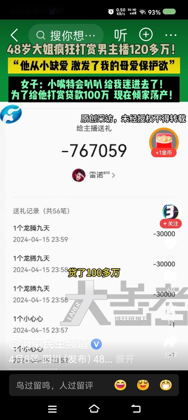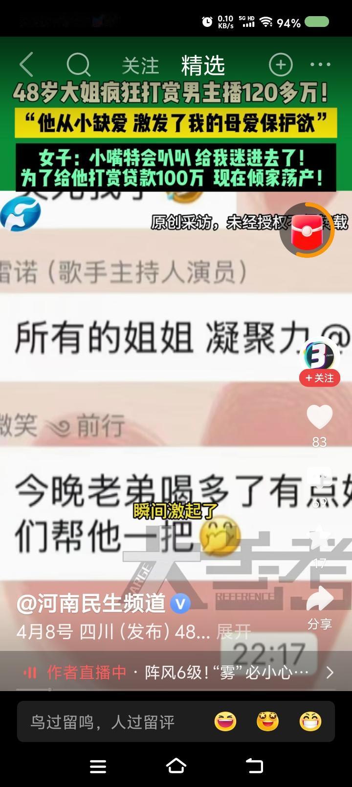 大姐,有人同情你么?—— 据报道,一女子打赏男主播120万以上,为了打赏贷款10