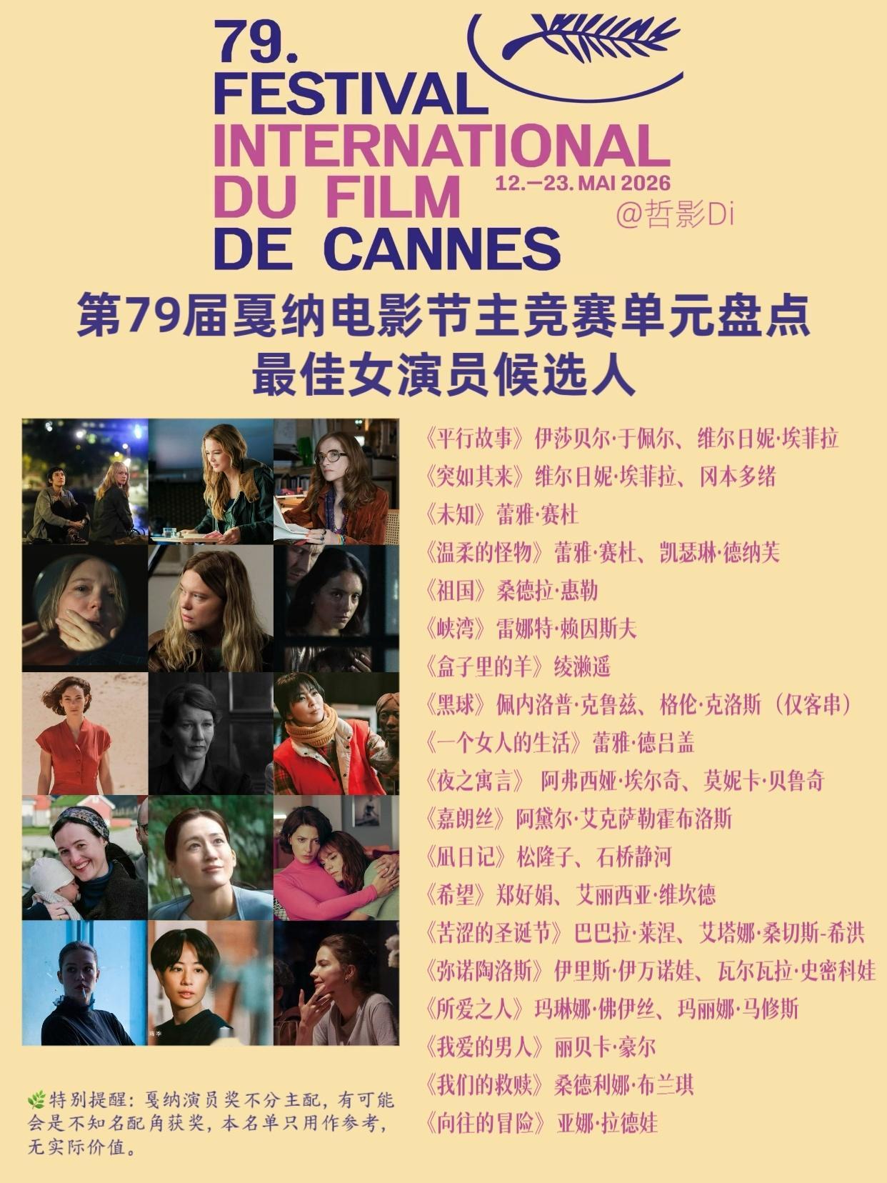 第79届戛纳电影节主竞赛单元🌿最佳女演员即戛纳影后候选人盘点,今年阵容上星光很强,总结起来就是欧女扎堆。其中蕾雅·赛杜、维尔日妮·埃菲拉都是双片冲奖,还有伊莎贝尔·于佩尔、桑德拉·惠勒、雷娜特·赖因斯夫、蕾雅·德吕盖这样的顶级影后,非常精彩。以下为候选人名单↓ ↓ ↓