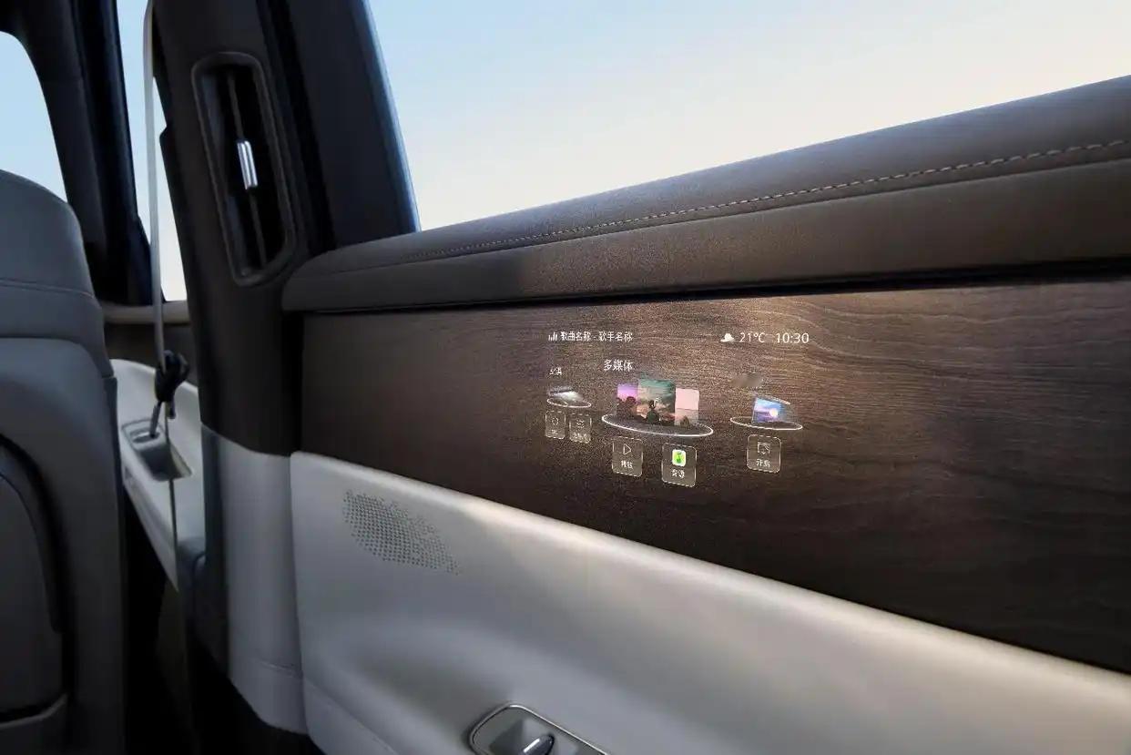 座舱内实现九屏联动,包括前排15.6英寸中控双联屏,后排21.4英寸吸顶屏以及3块Smart Surface魔术屏等。