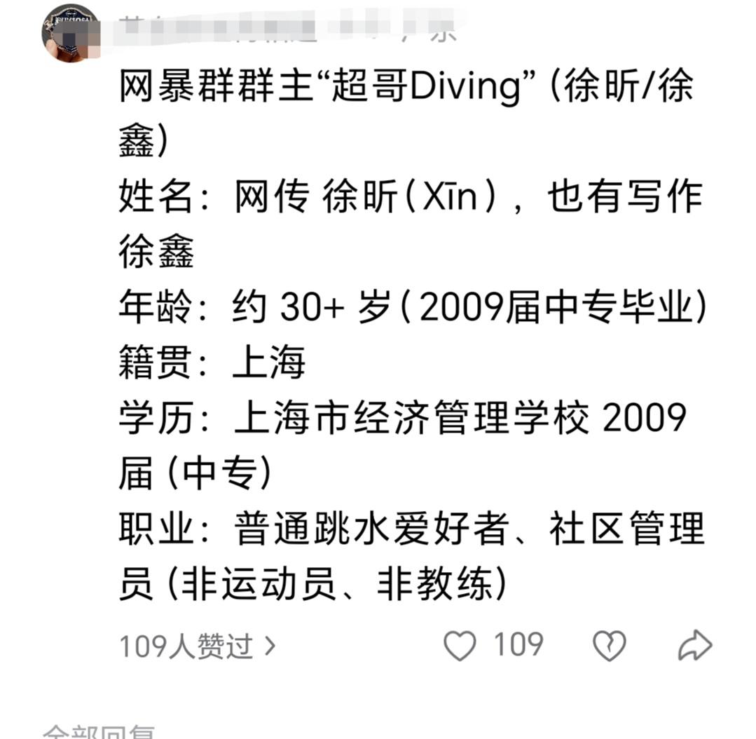 港媒曝光的辱骂全红婵的282人微信群(水花征服者联盟)解散了,但是组织者被曝光,群主叫徐昕,男,30岁左右,应该是上海人。