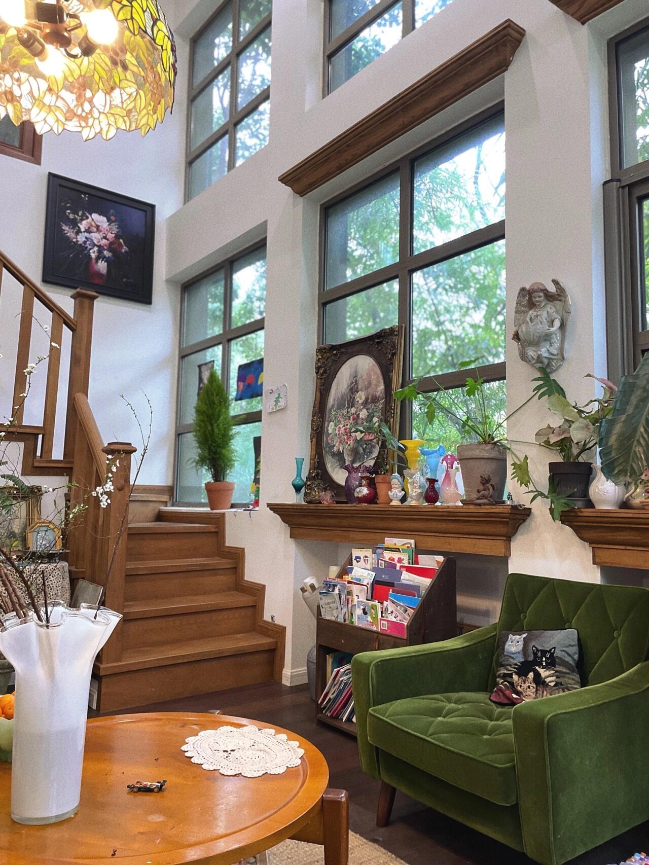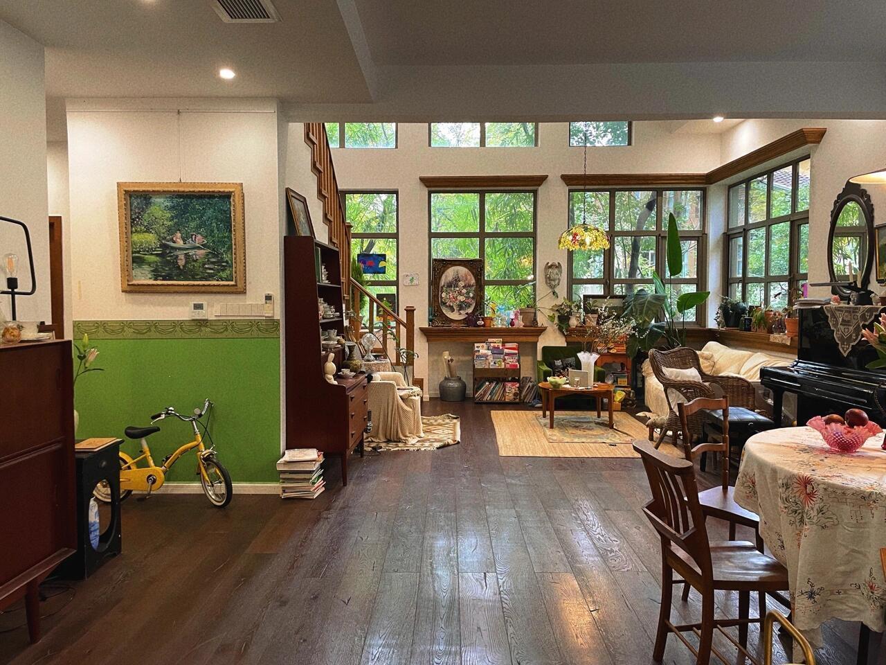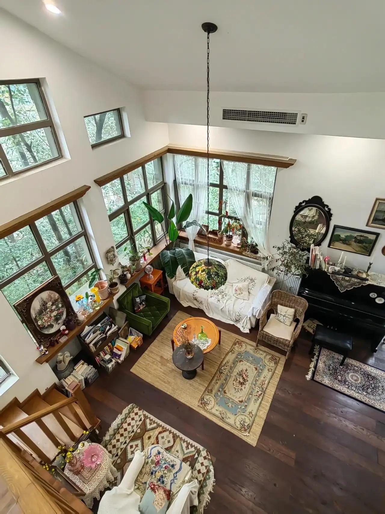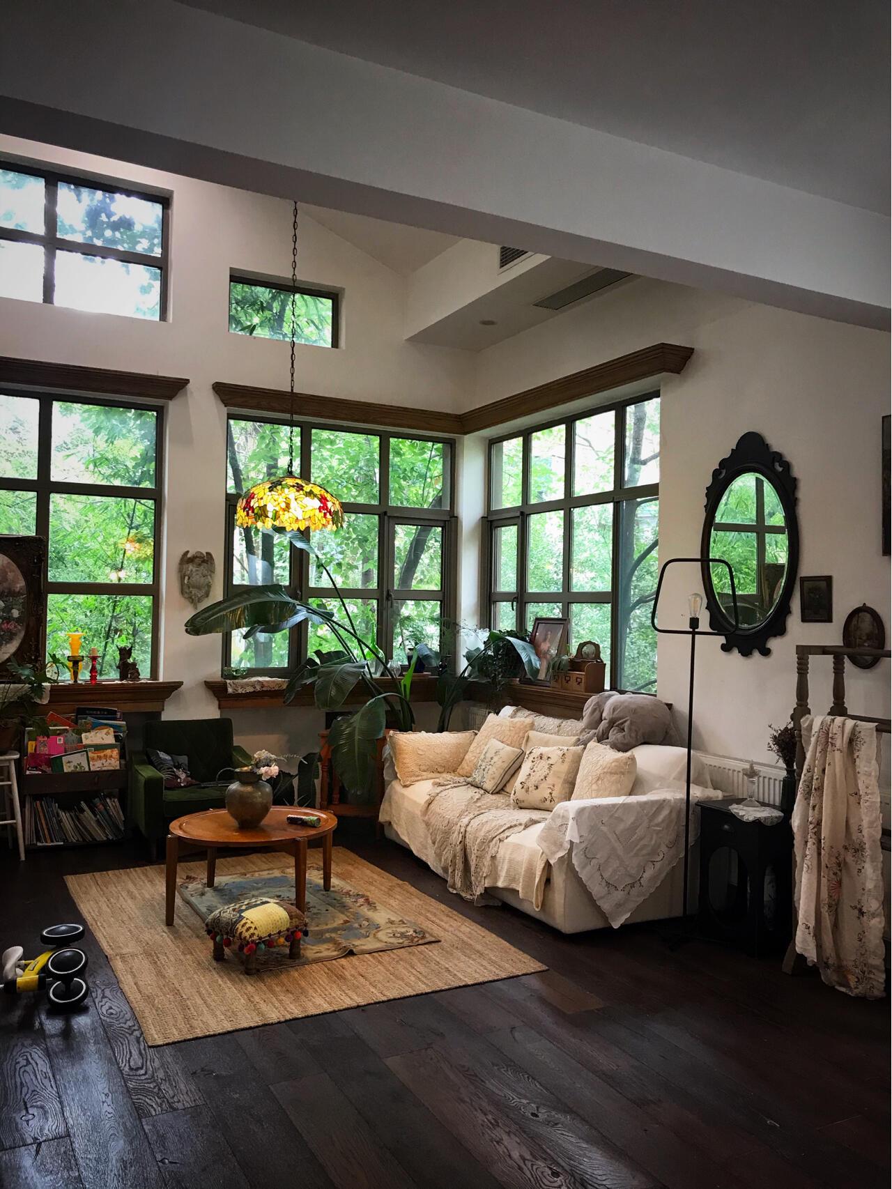 走进屋子的那一刻,我们俩同时安静了。九扇大窗户,每一扇望出去都是满满的绿意——不是那种规整的小区绿化,而是野蛮生长的树冠,层层叠叠,像住在半山腰的树屋里。风一吹,树叶就沙沙地响,阳光被筛成碎金,洒在空荡荡的地板上。